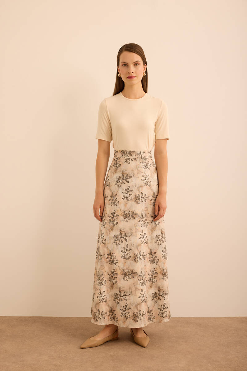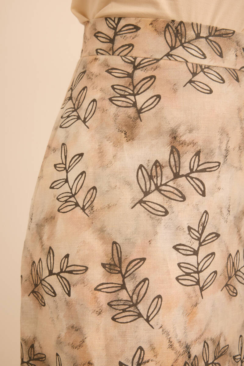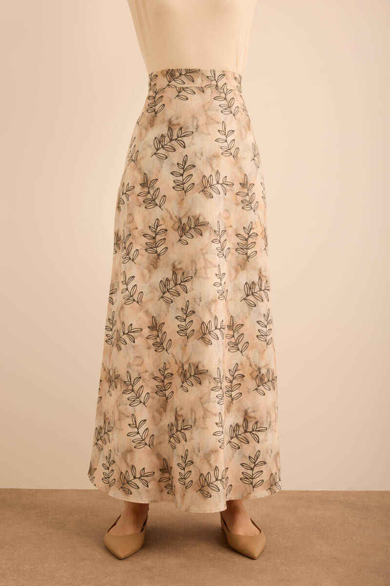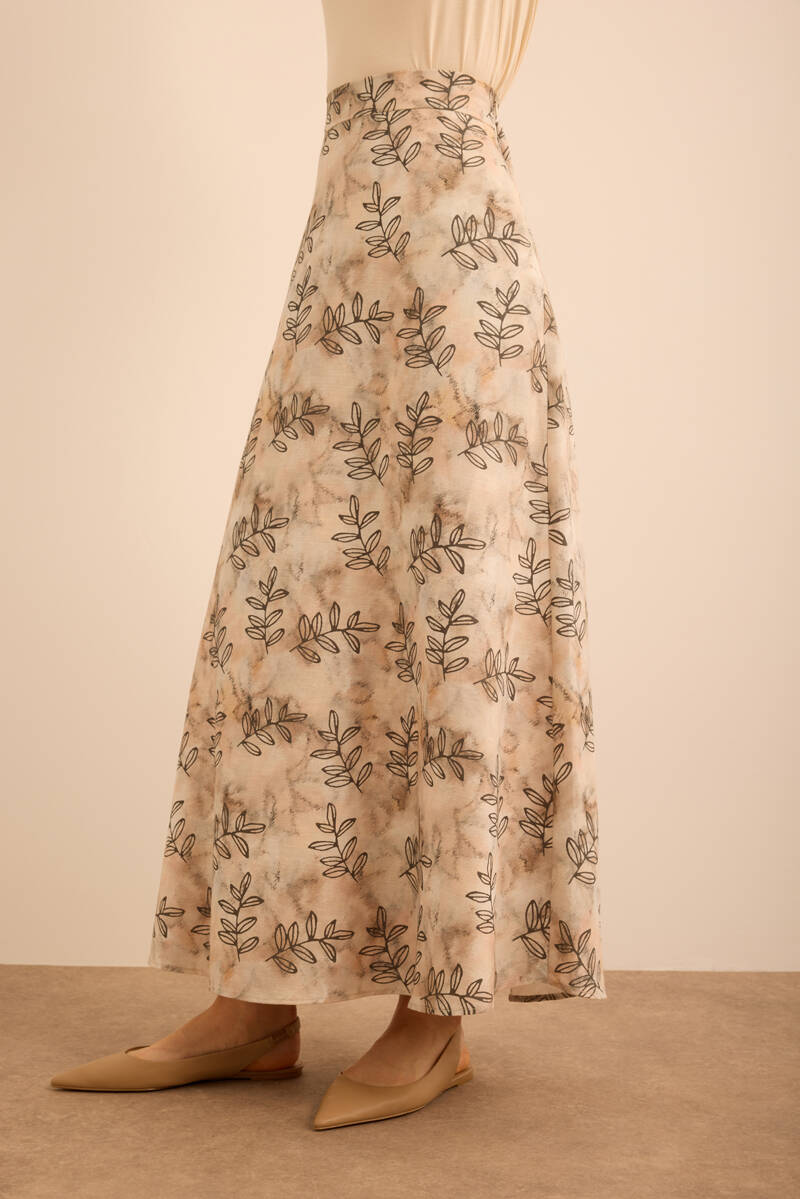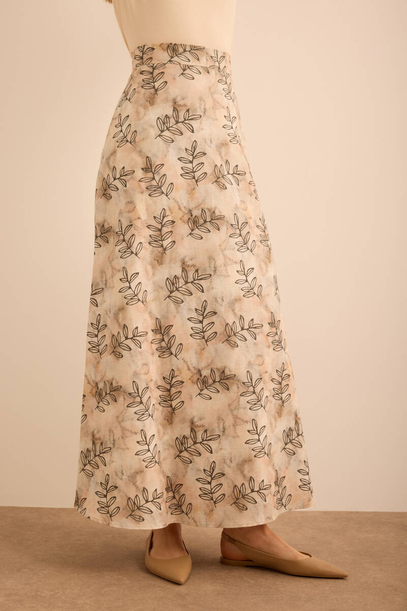 Ekru Yaprak Desenli Keten Etek