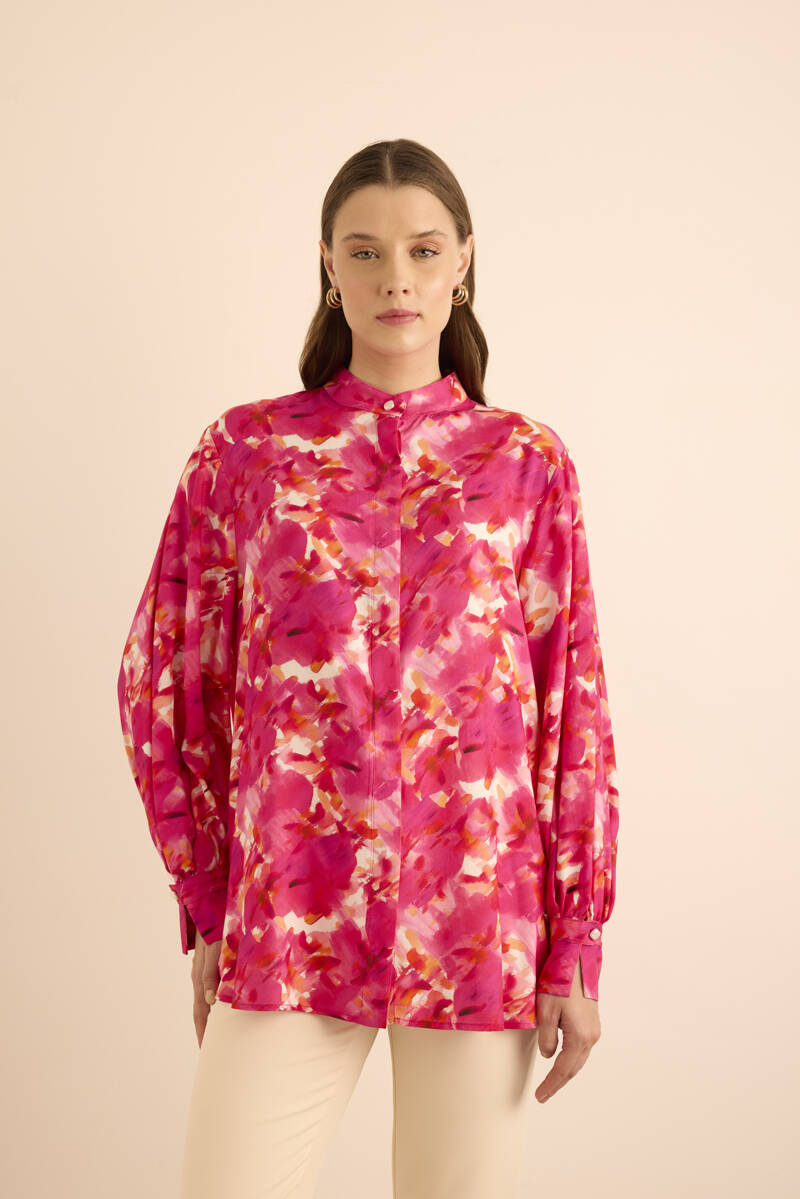 Fuşya Ön Göğüs Kısmı Pile ve Parça Detaylı Bluz