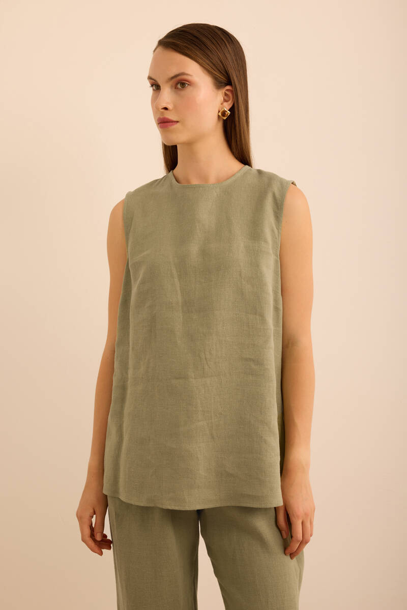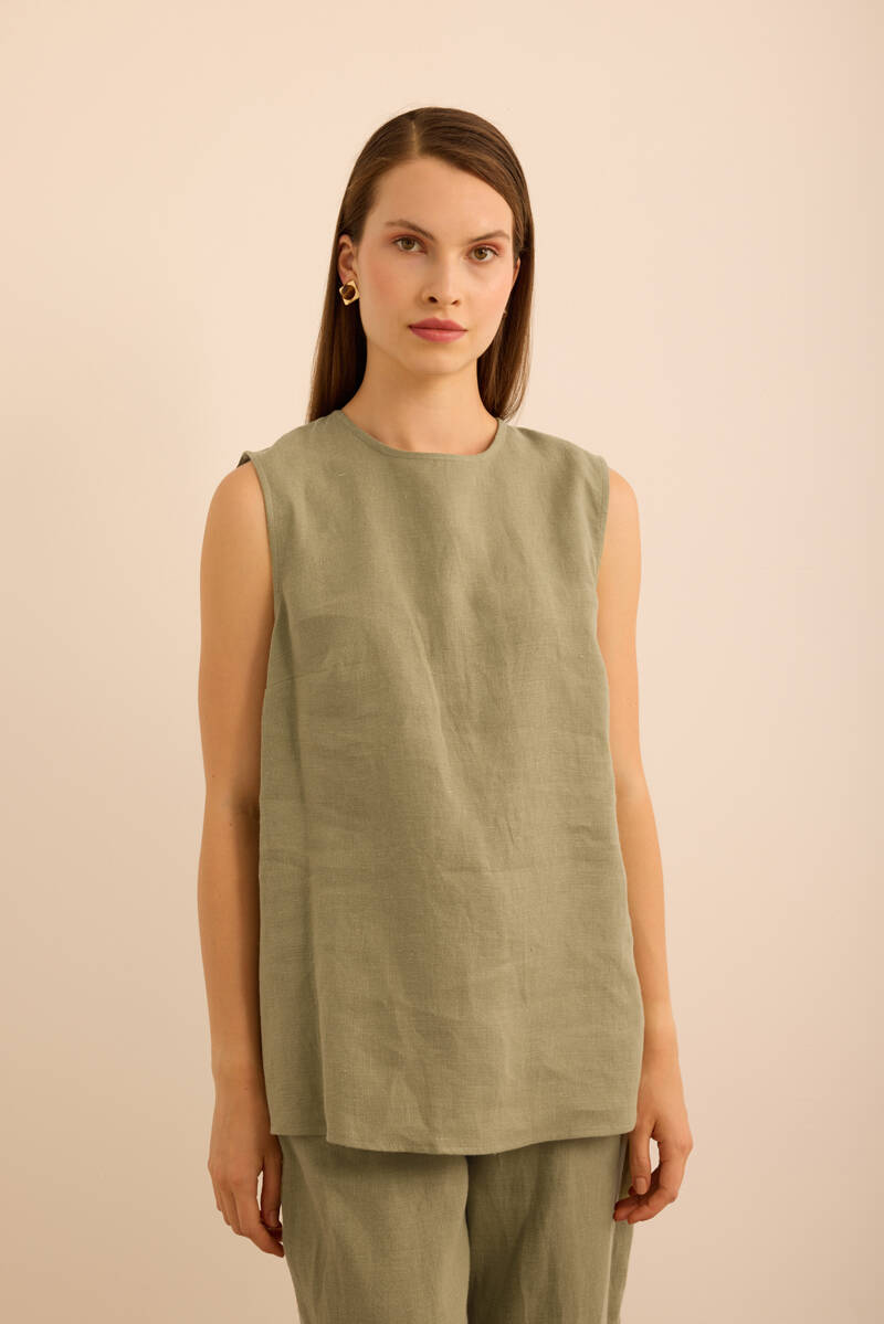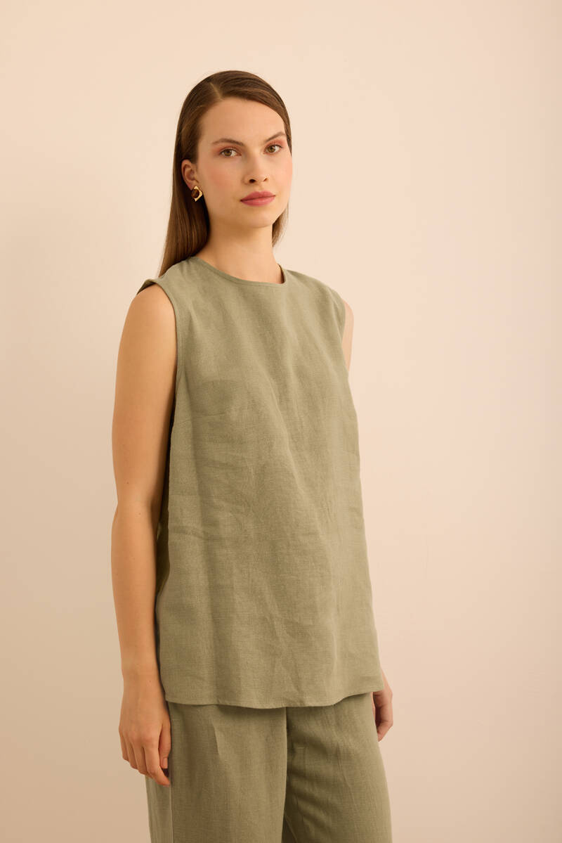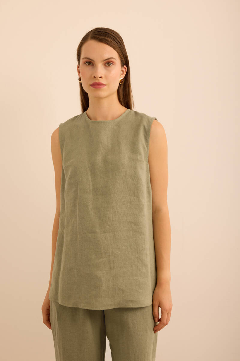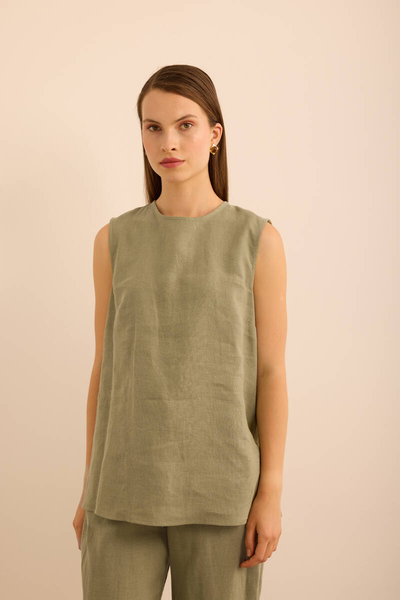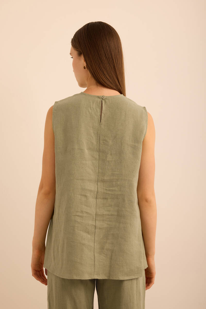 Haki Önü Kup Detaylı Kolsuz Keten Bluz