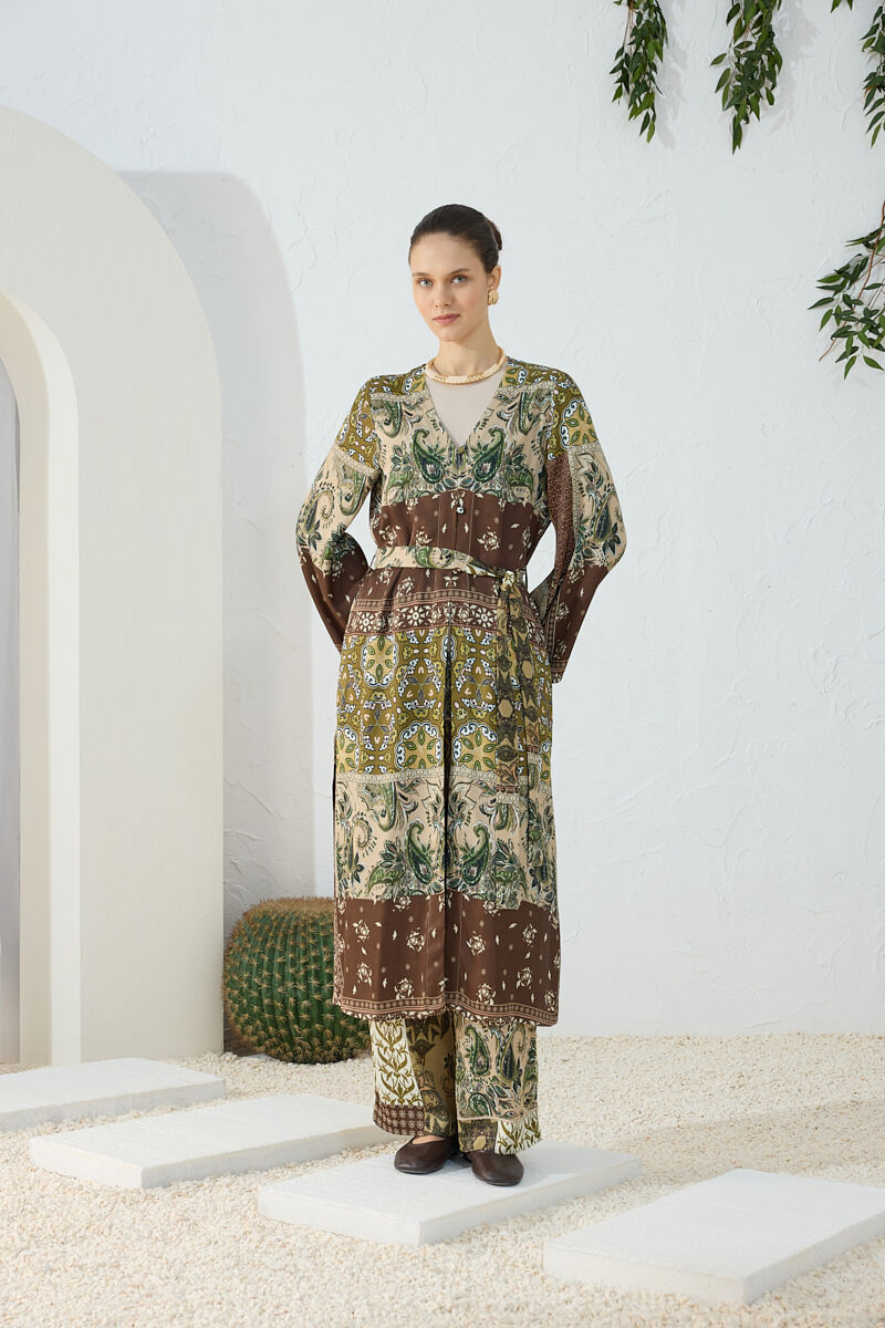 Ekru Yaprak Desenli Keten Yandan Bağlamalı Kimono