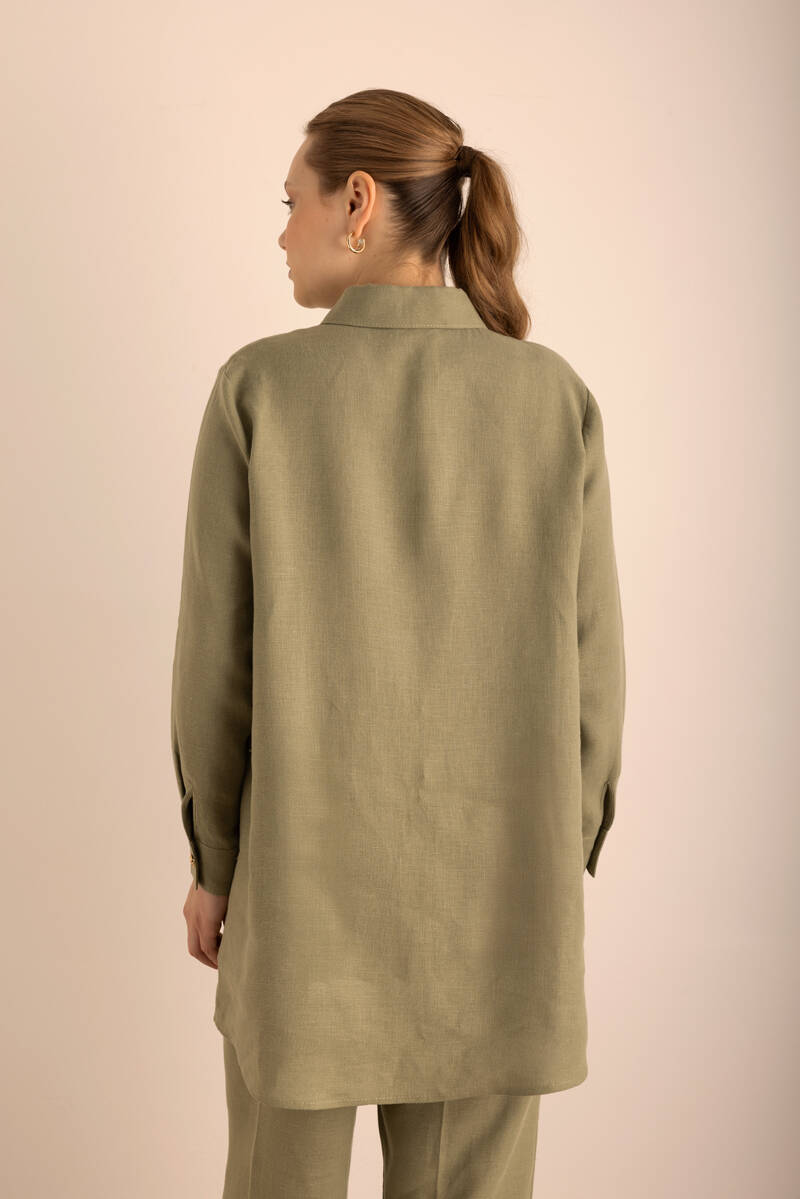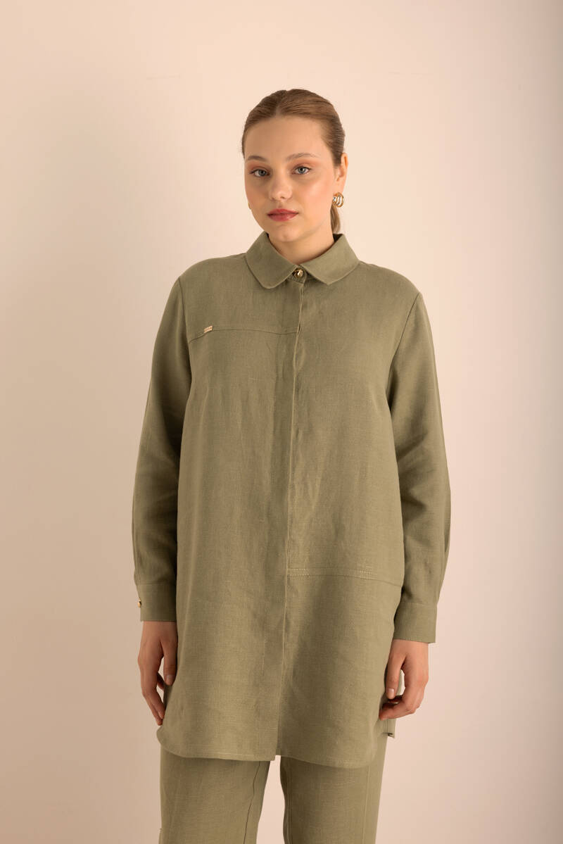 Kahverengi Yakası Fermuarlı Keten Tencel Tunik