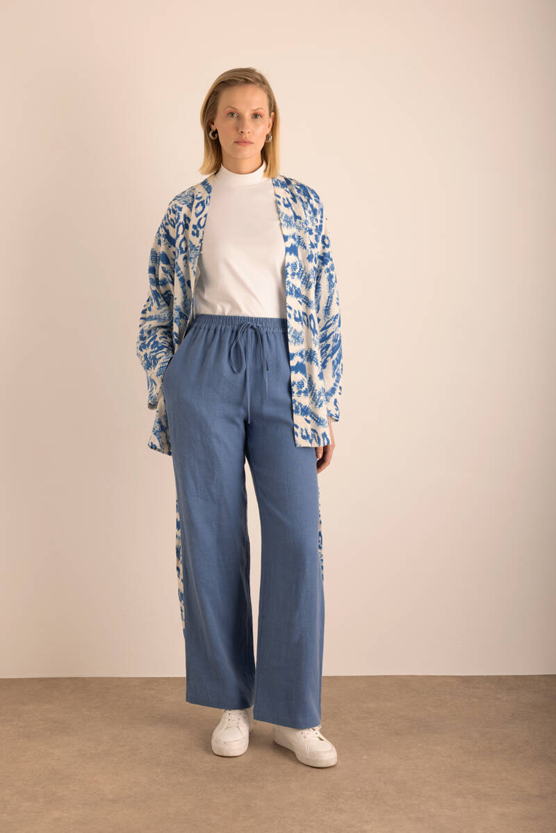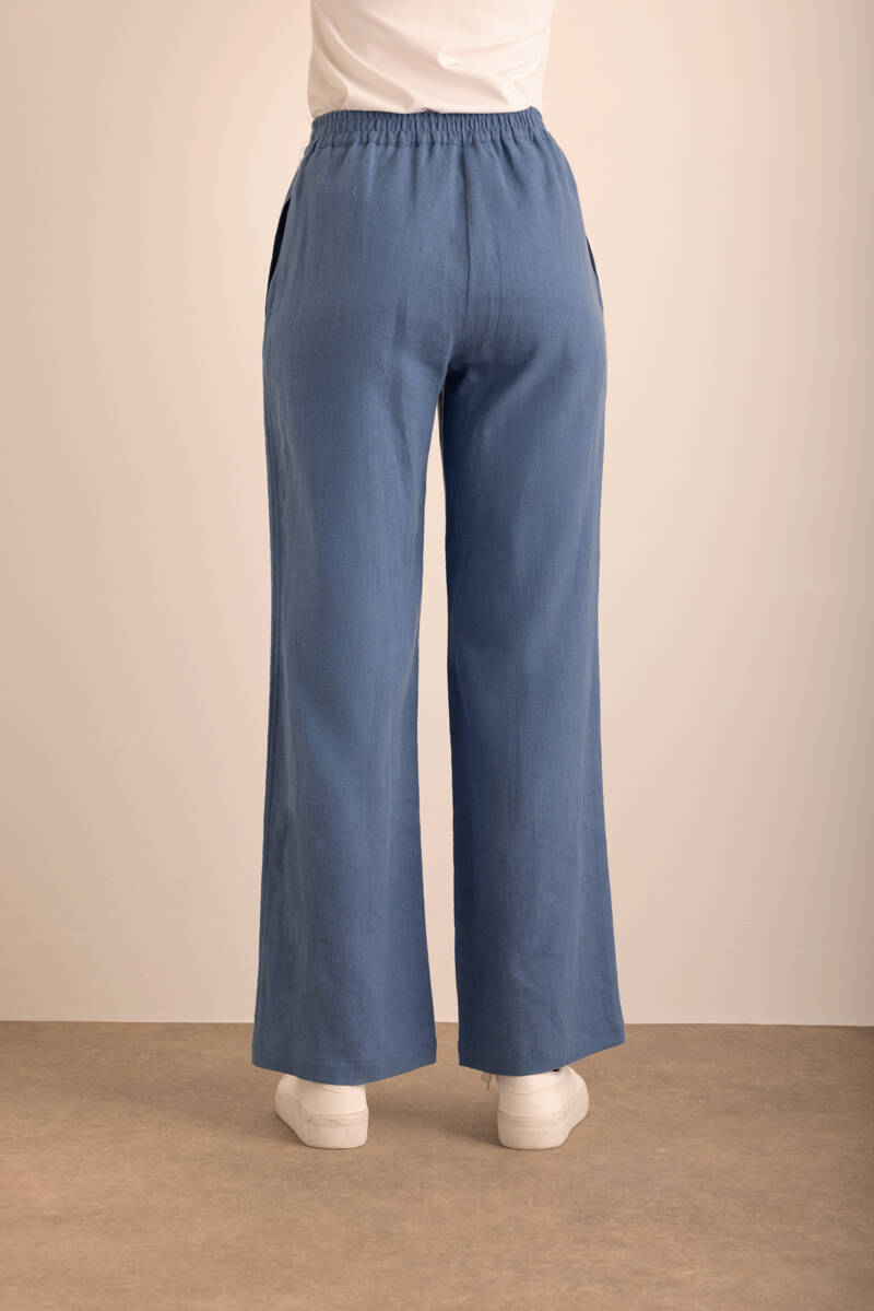Mavi Beli Lastikli Keten Pantolon