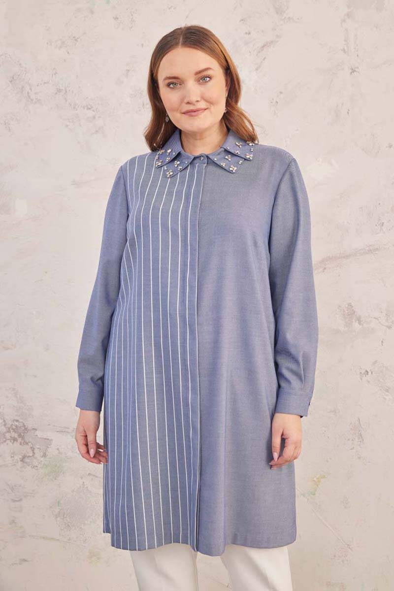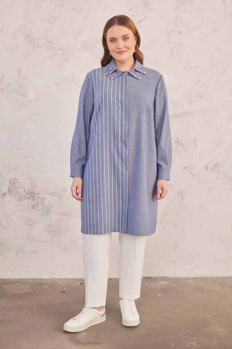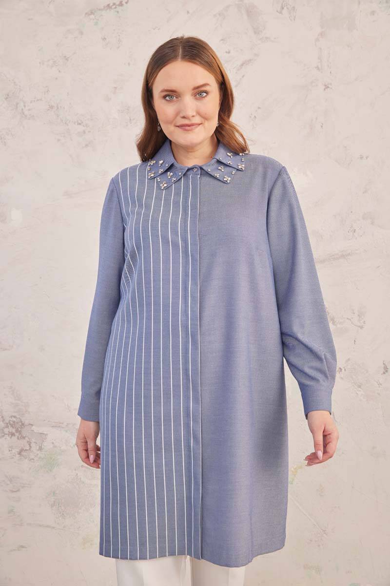 İndigo Çift Yaka Detaylı İşlemeli Tunik
