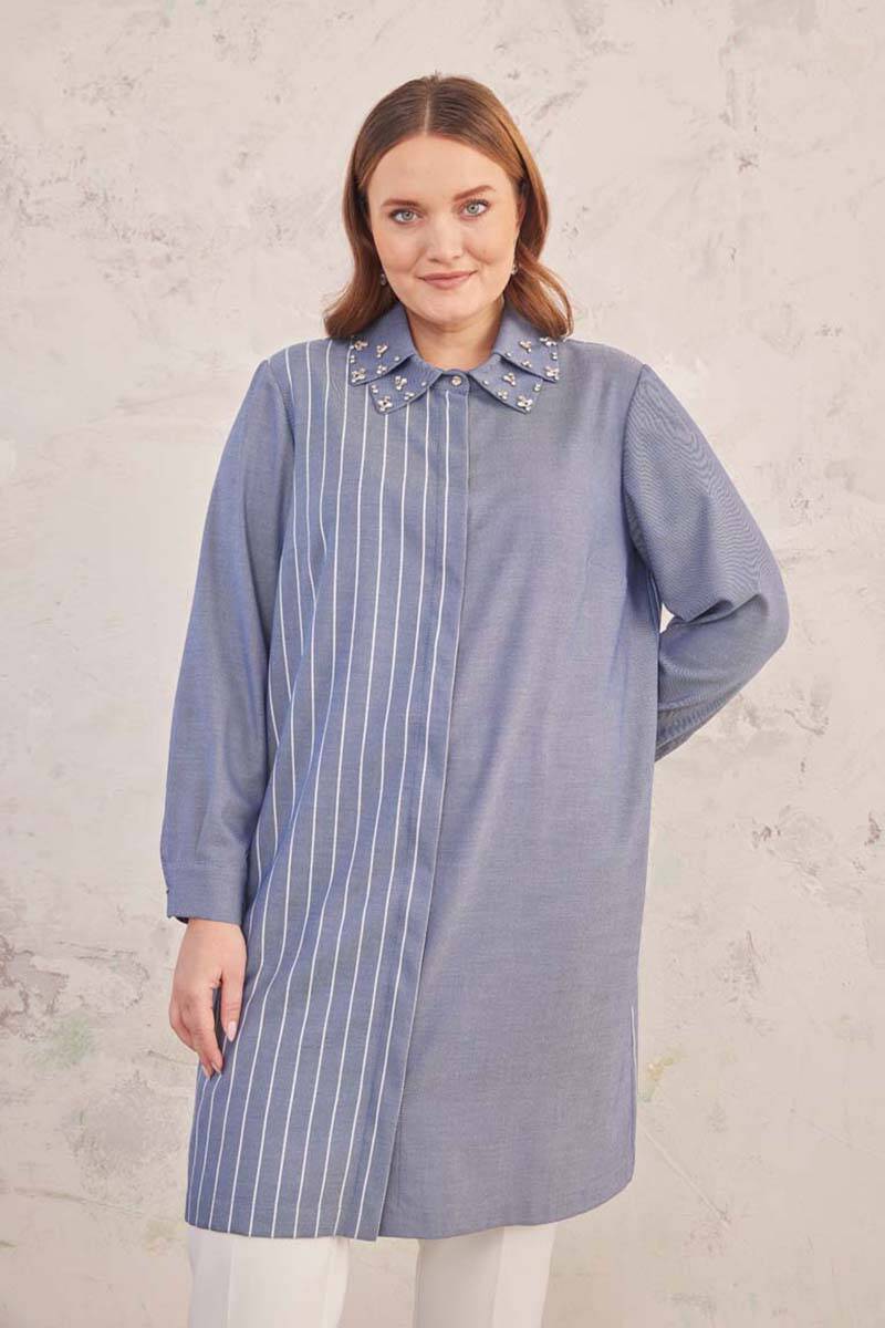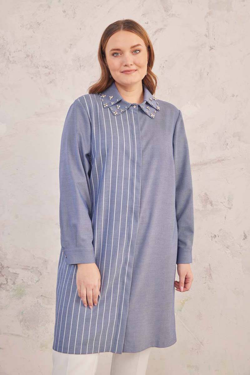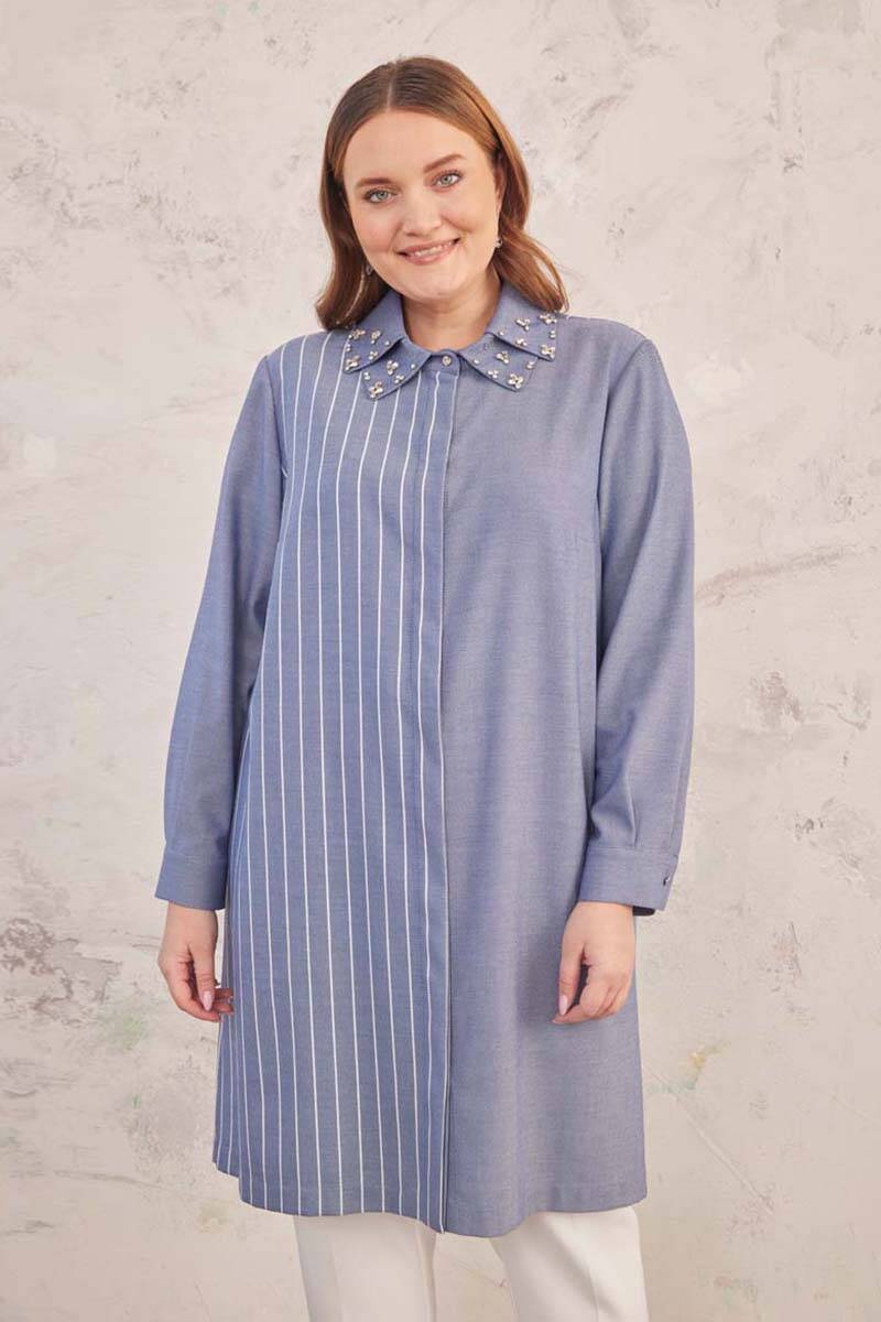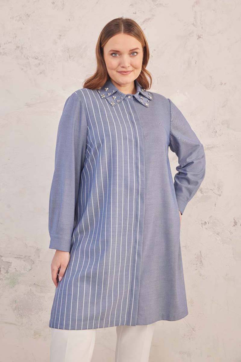 İndigo Çift Yaka Detaylı İşlemeli Tunik
