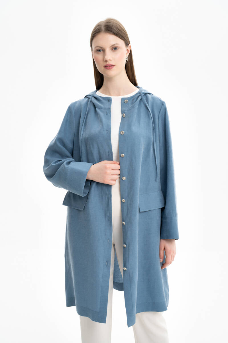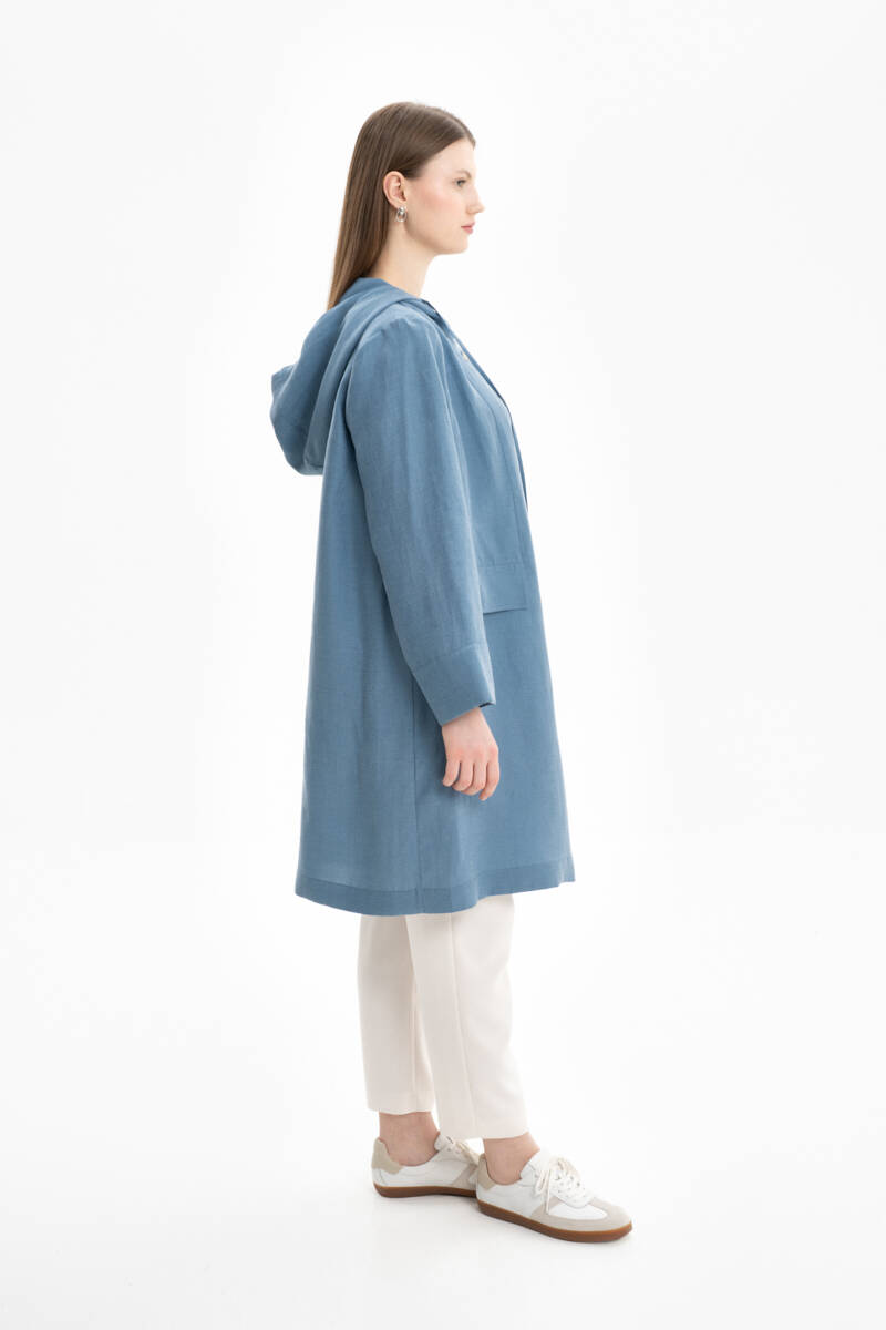 İndigo Kapüşonlu Keten Kap