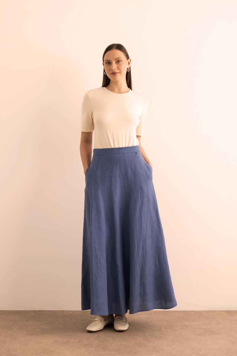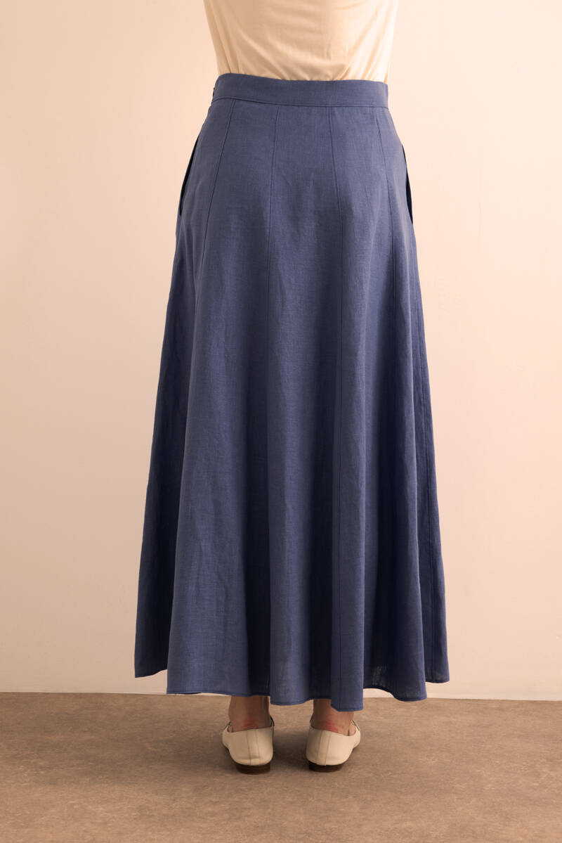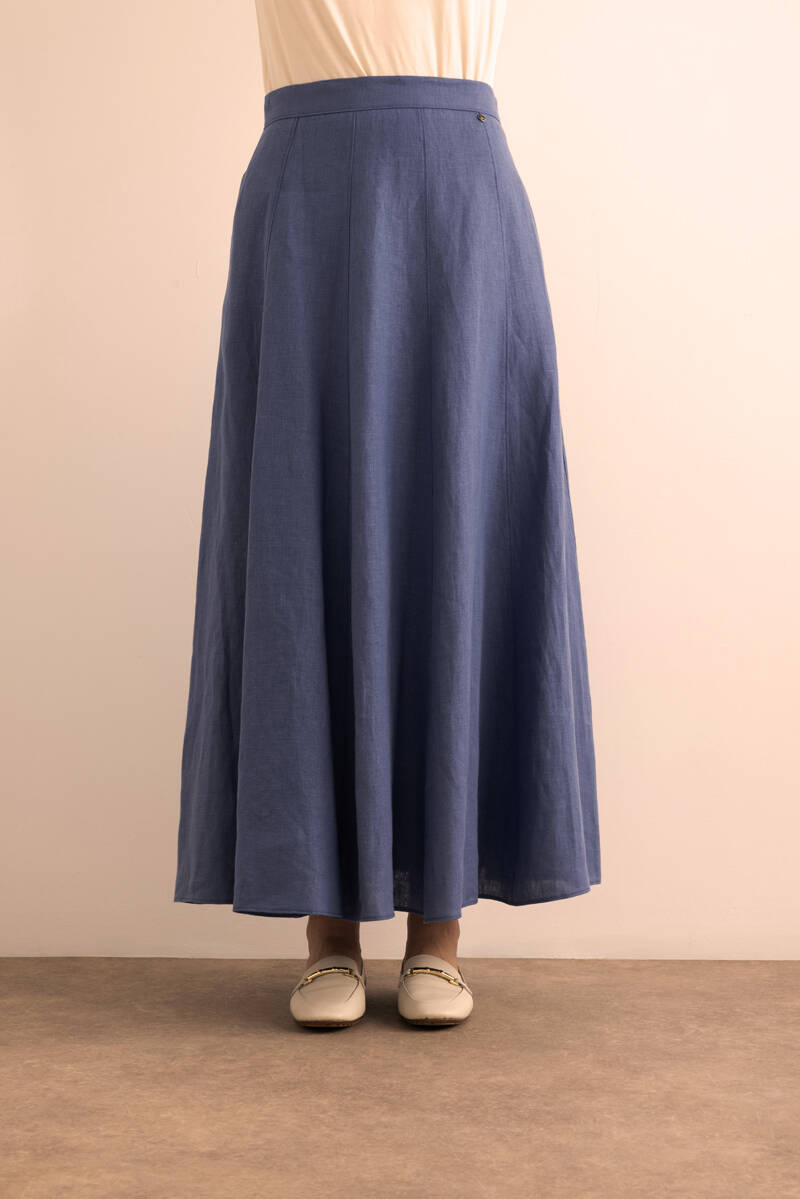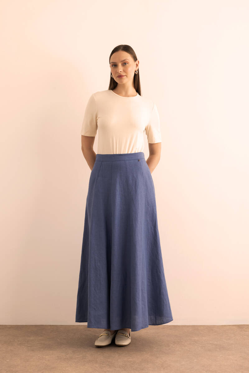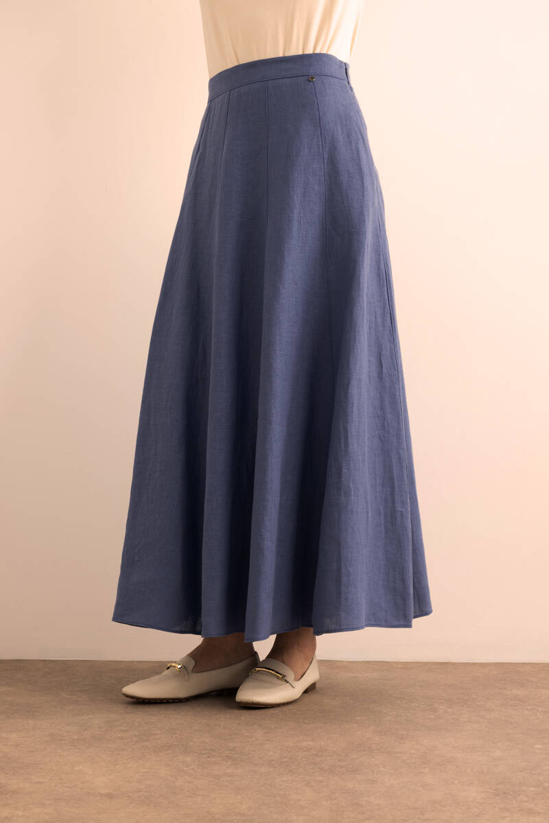 Mavi Desenli Kloş Viscon Keten Etek