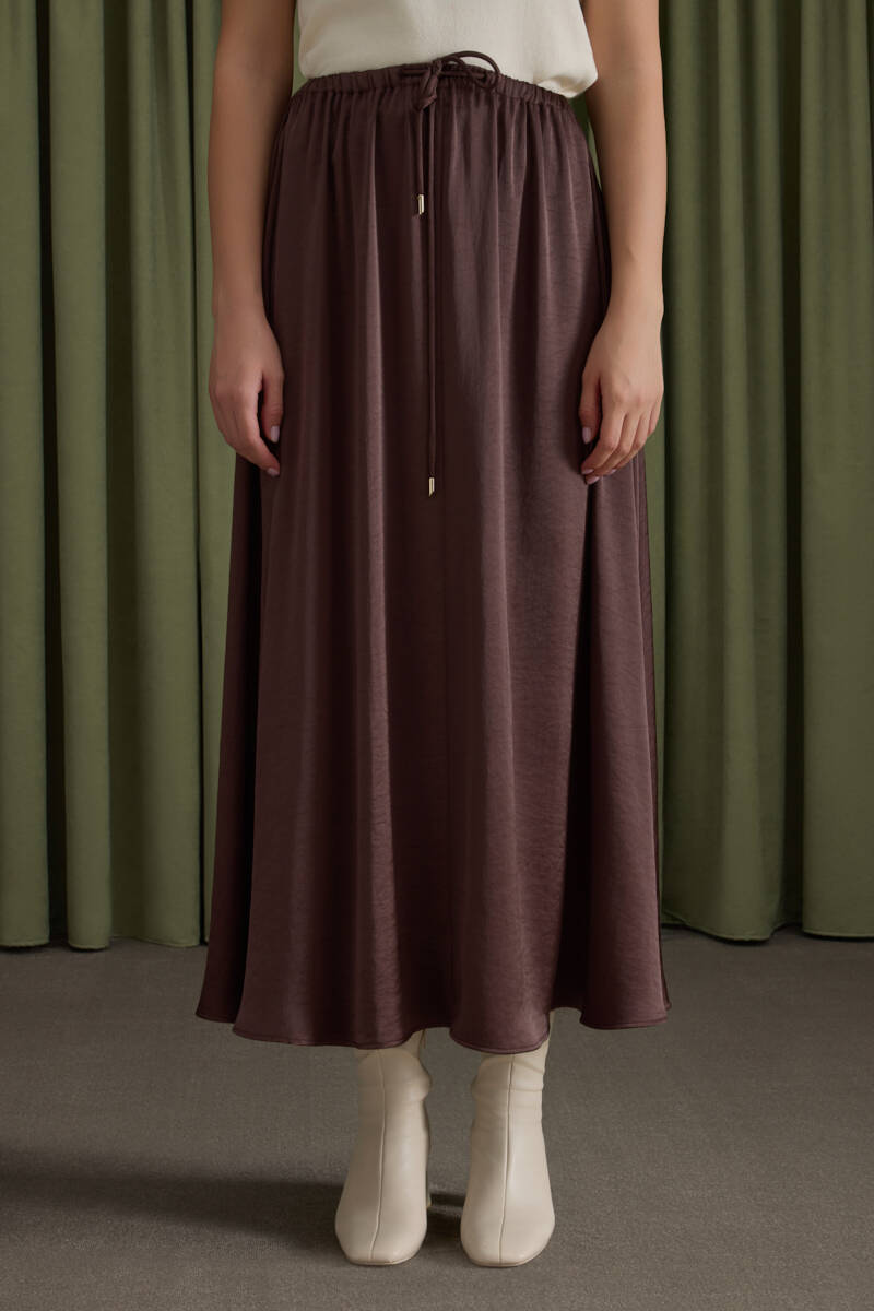 Kahverengi Beli Bağcıklı Saten Etek