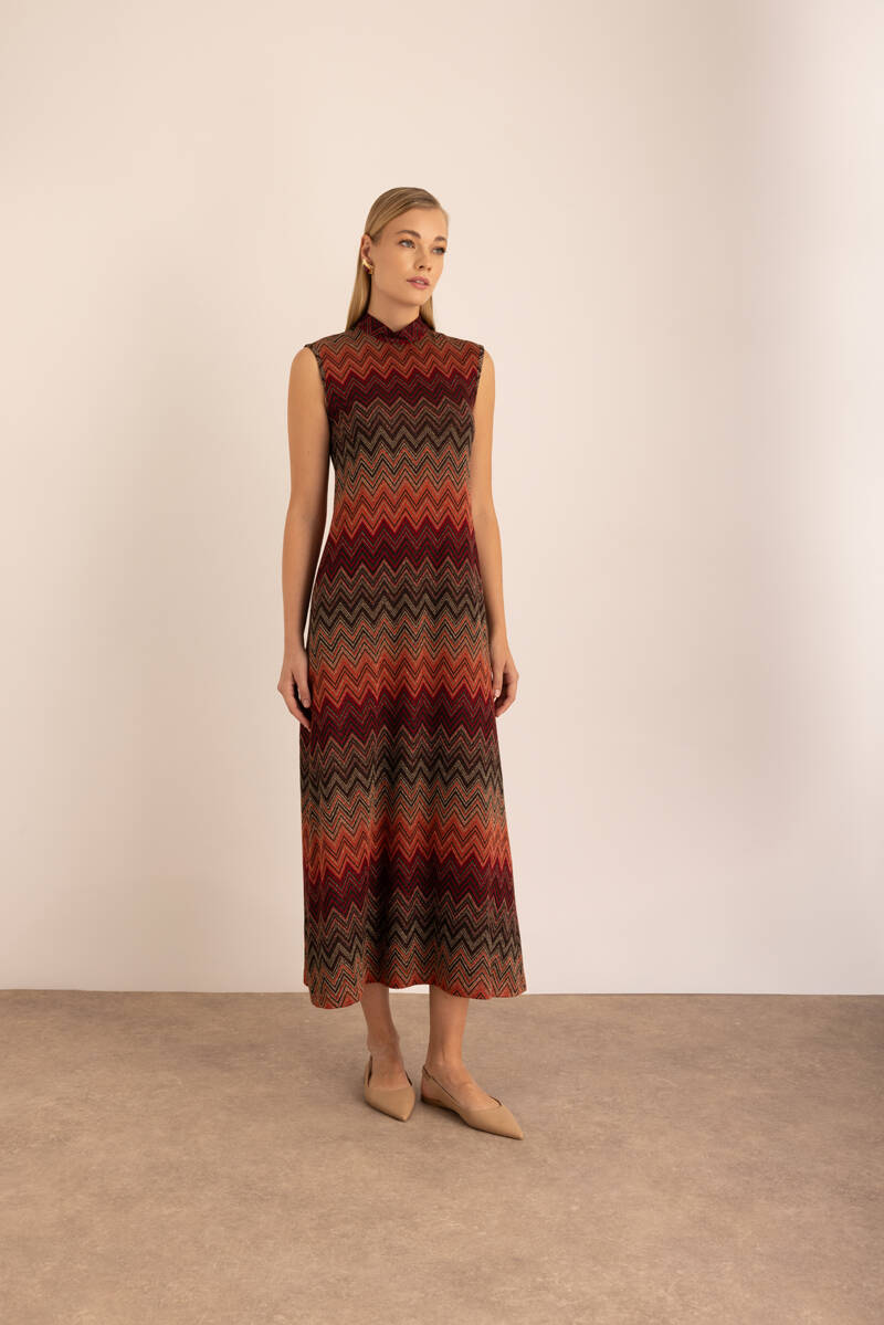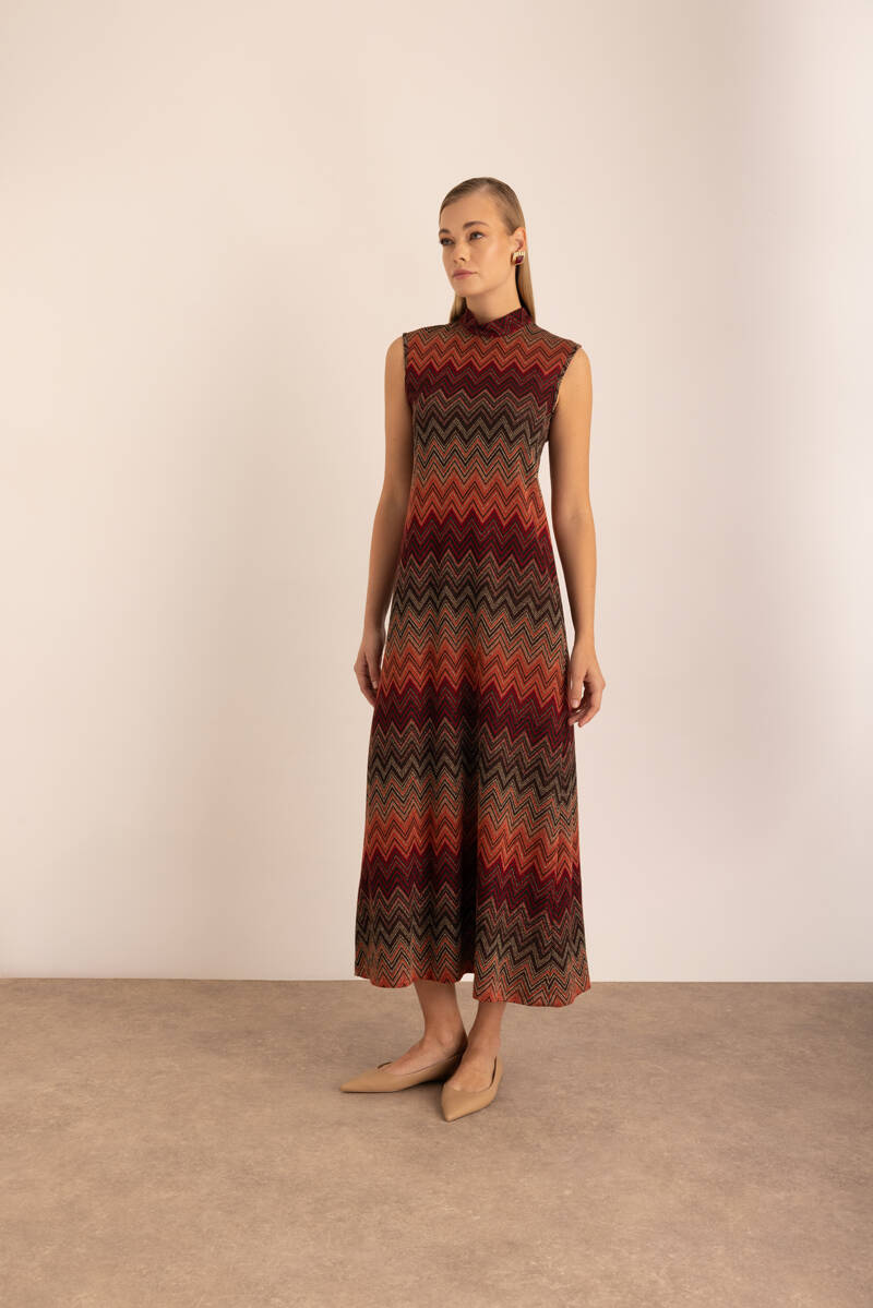 Kahverengi Desenli Simli Örme Kolsuz Elbise