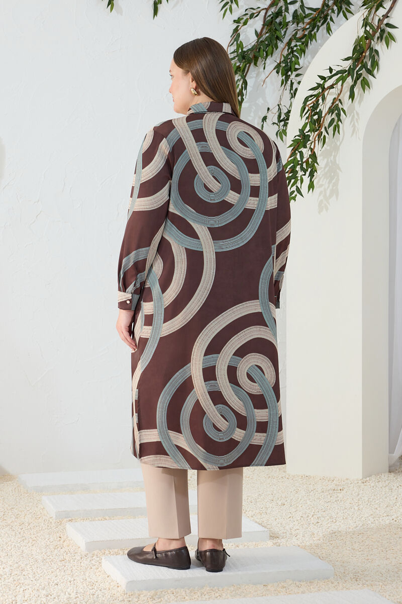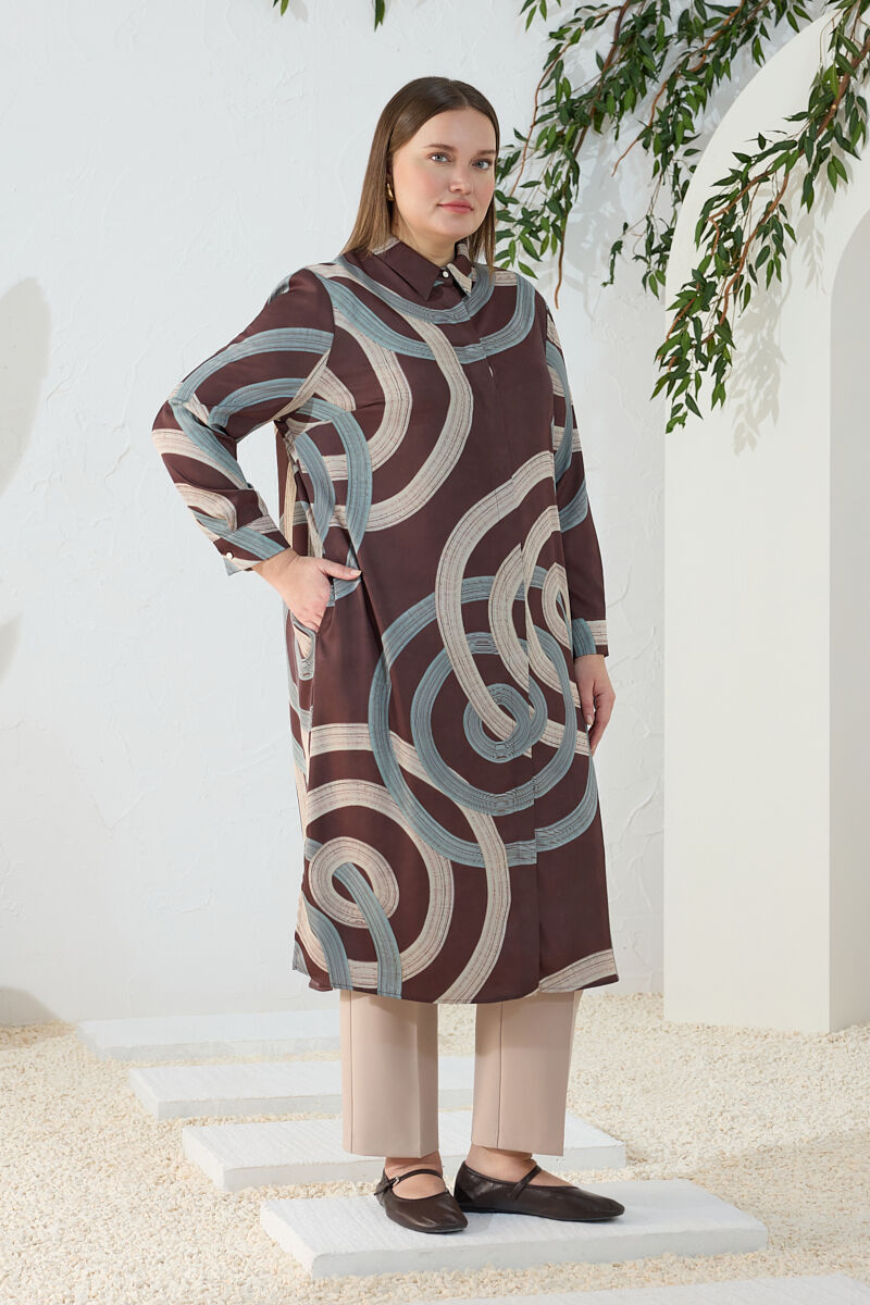 Kahverengi Yakası Fermuarlı Keten Tencel Tunik