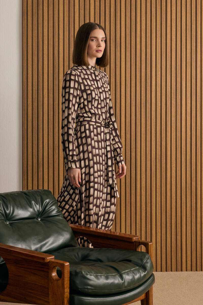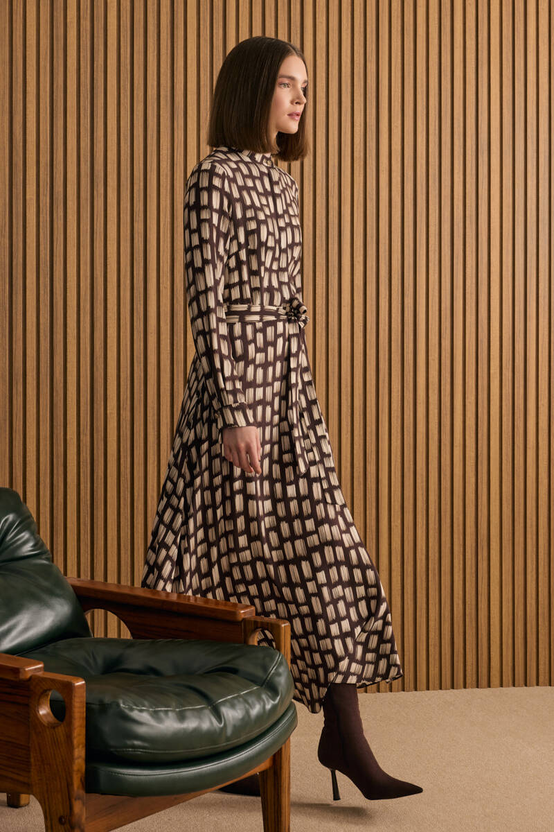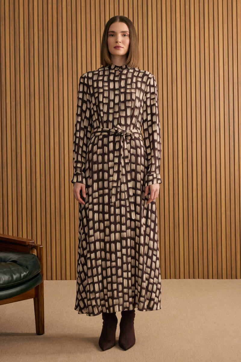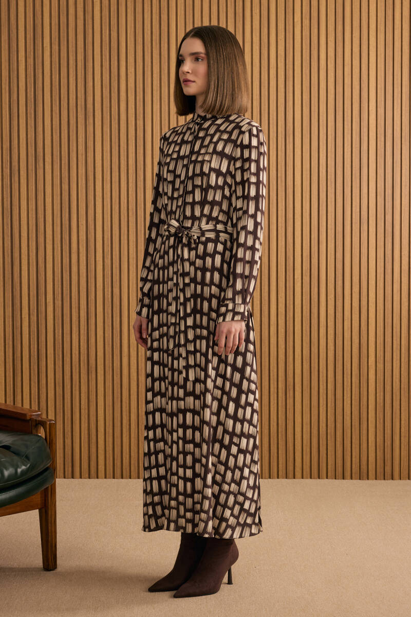 Somon Desenli Beli Bağlama Detaylı Elbise