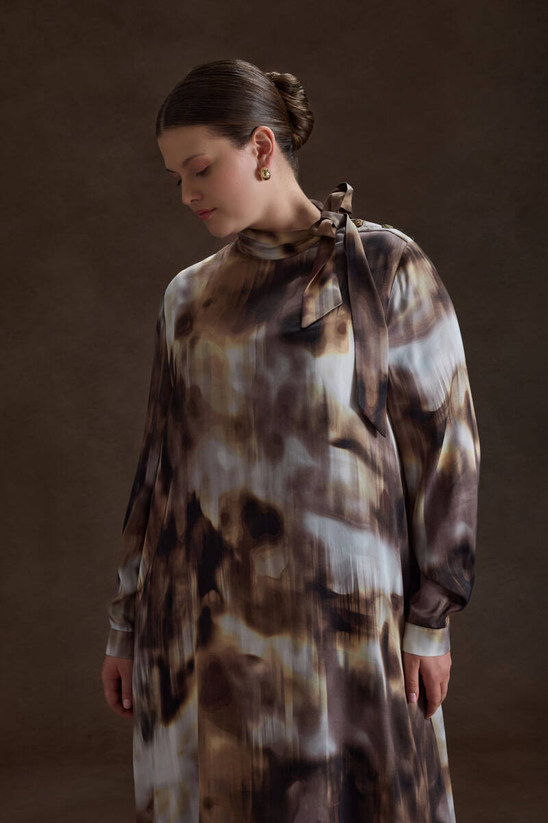 Kahverengi Desenli Yakası Bağcık Detaylı Viscon Elbise