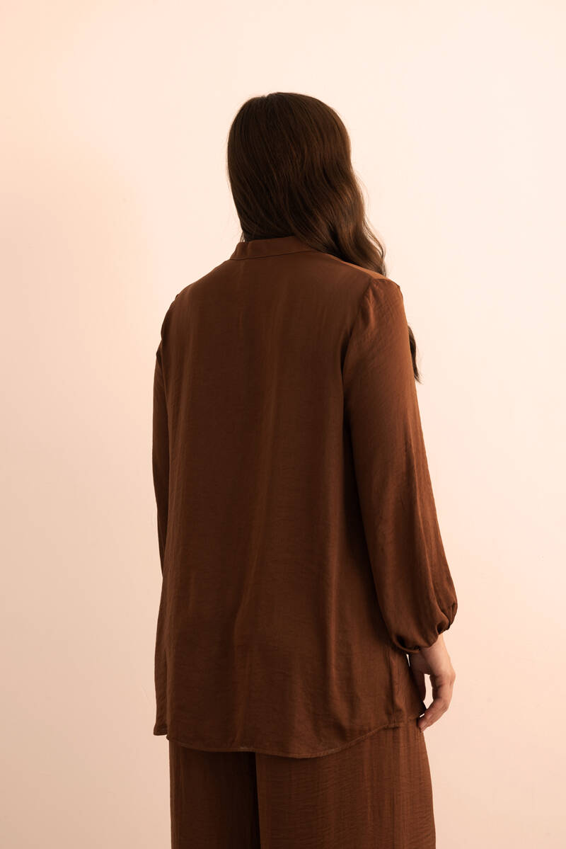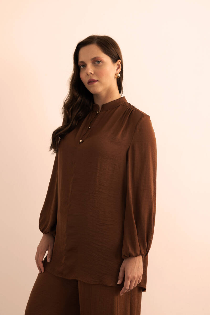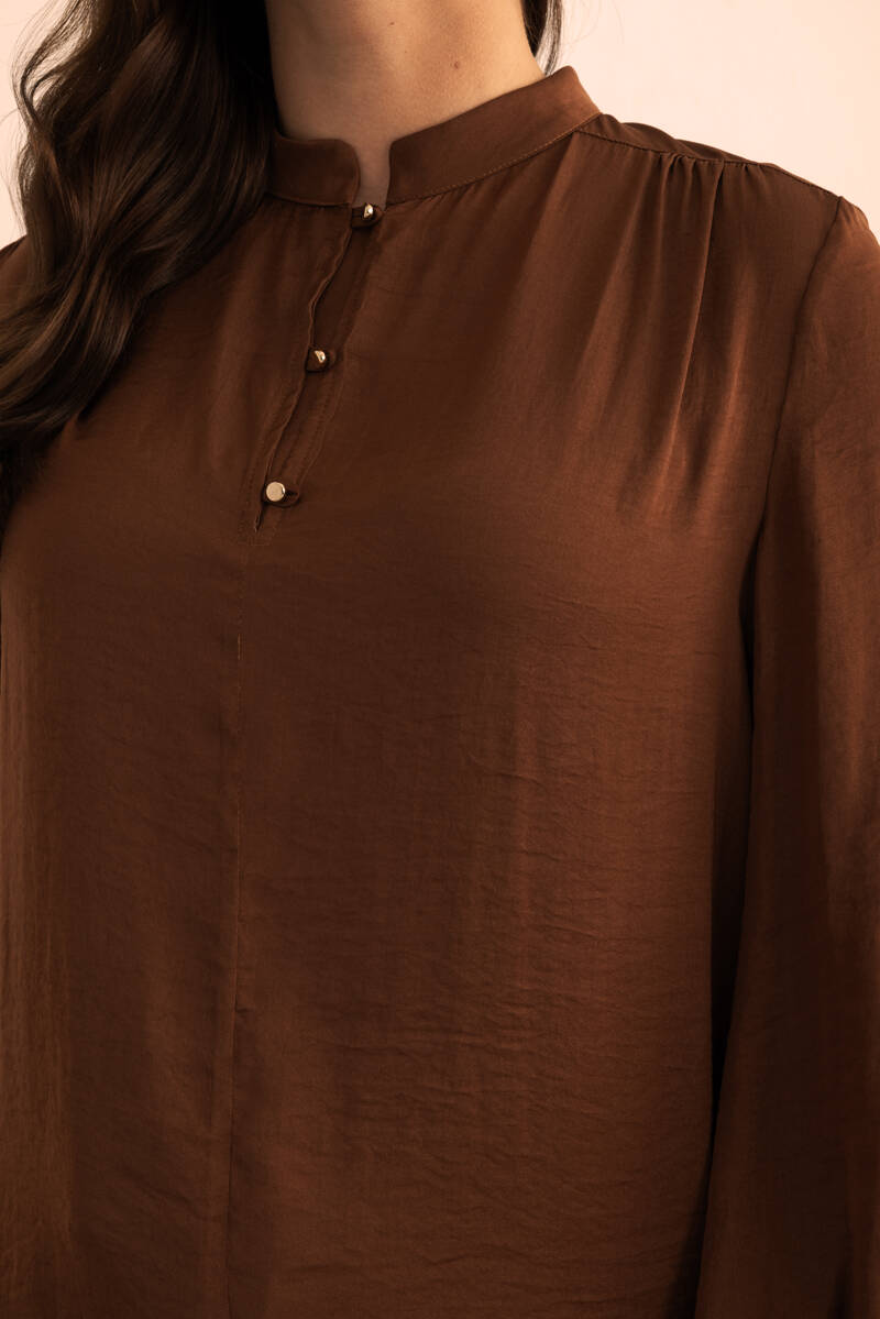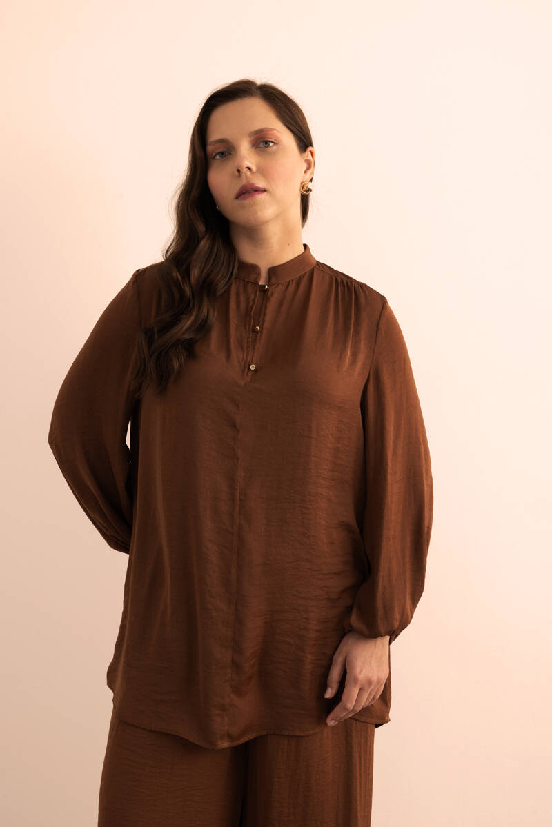 Kahverengi Yakası Fermuarlı Keten Tencel Tunik