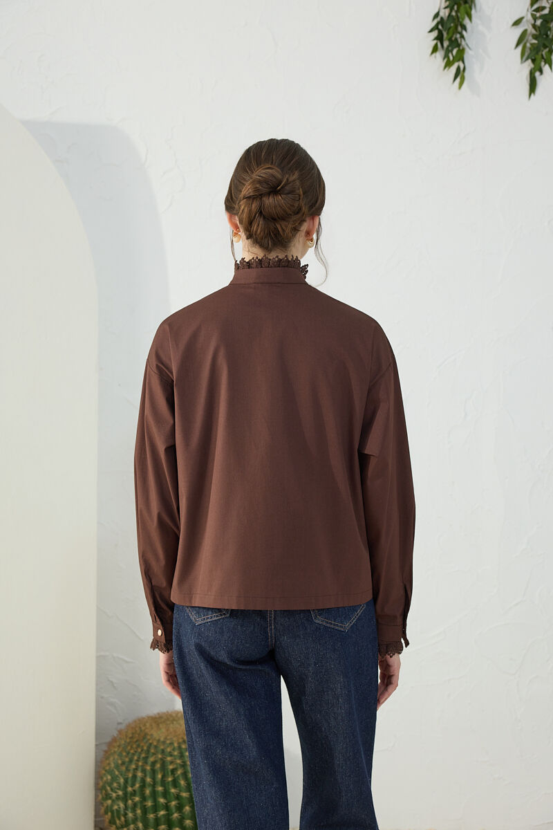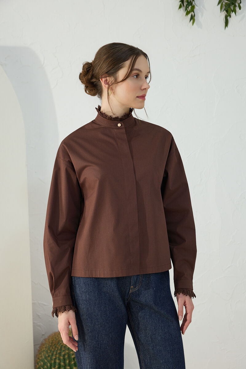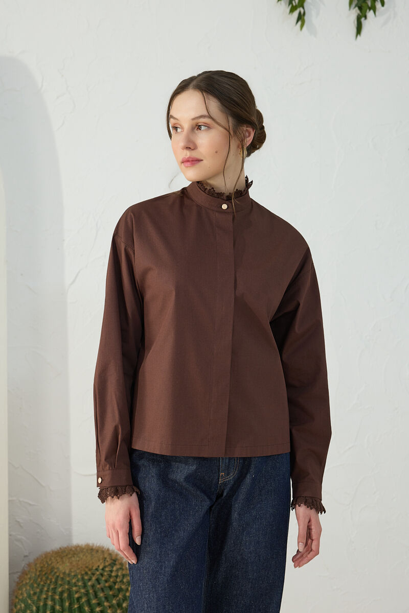 Pembe Batik Desenli Dik Yakalı Bluz