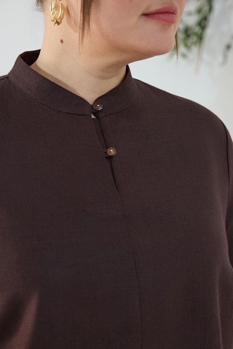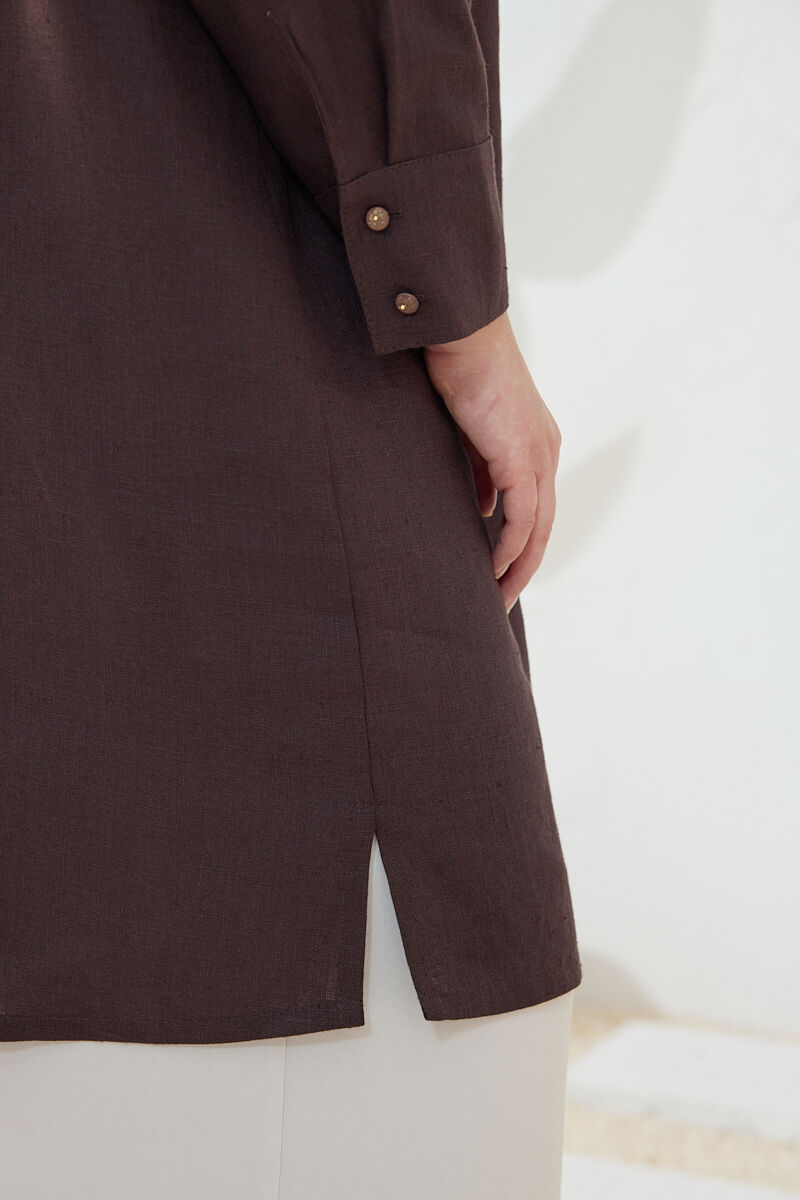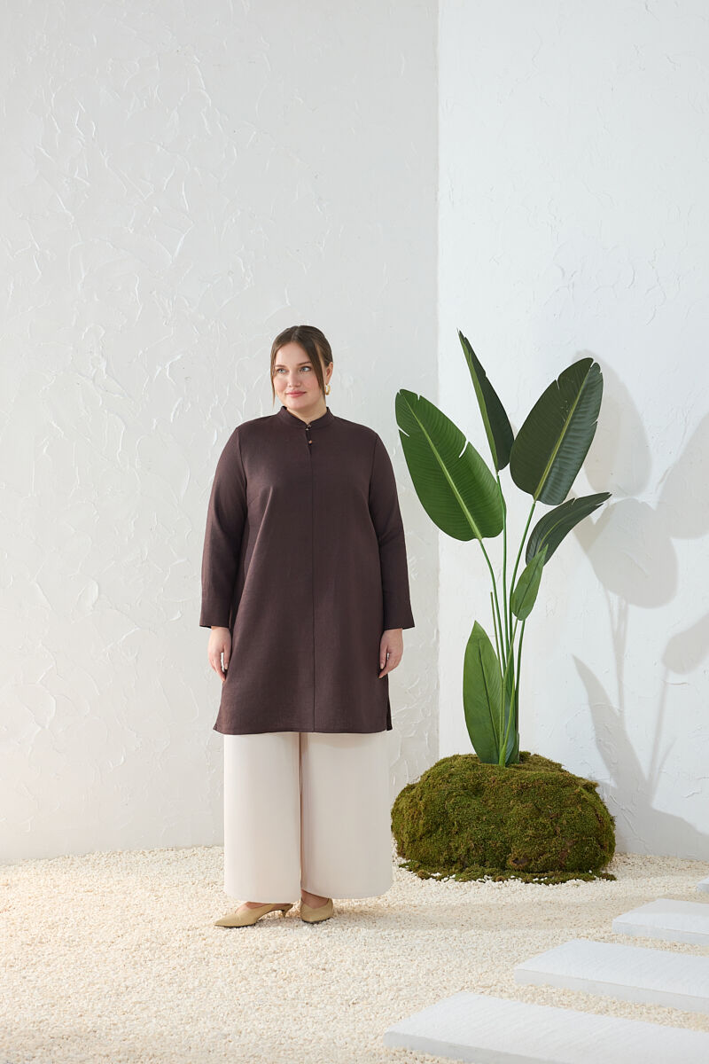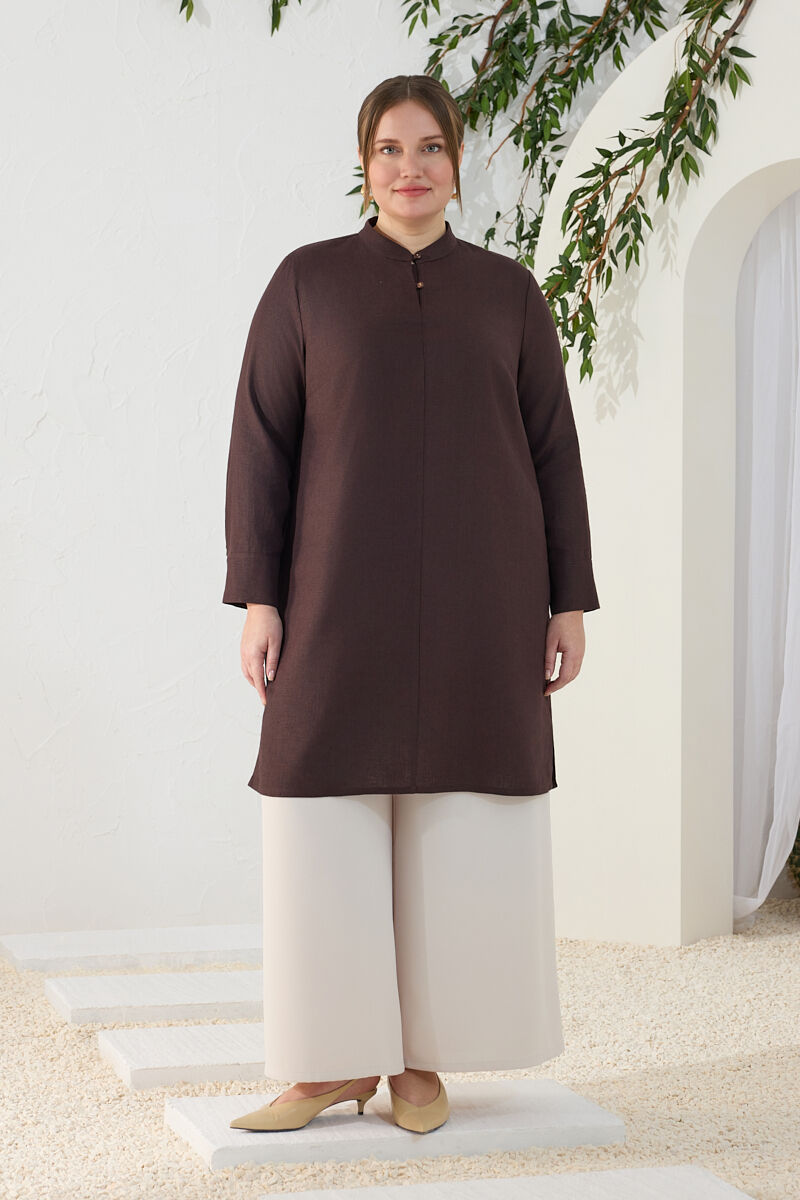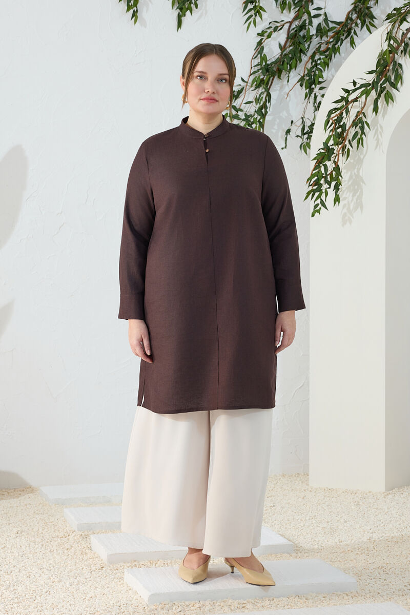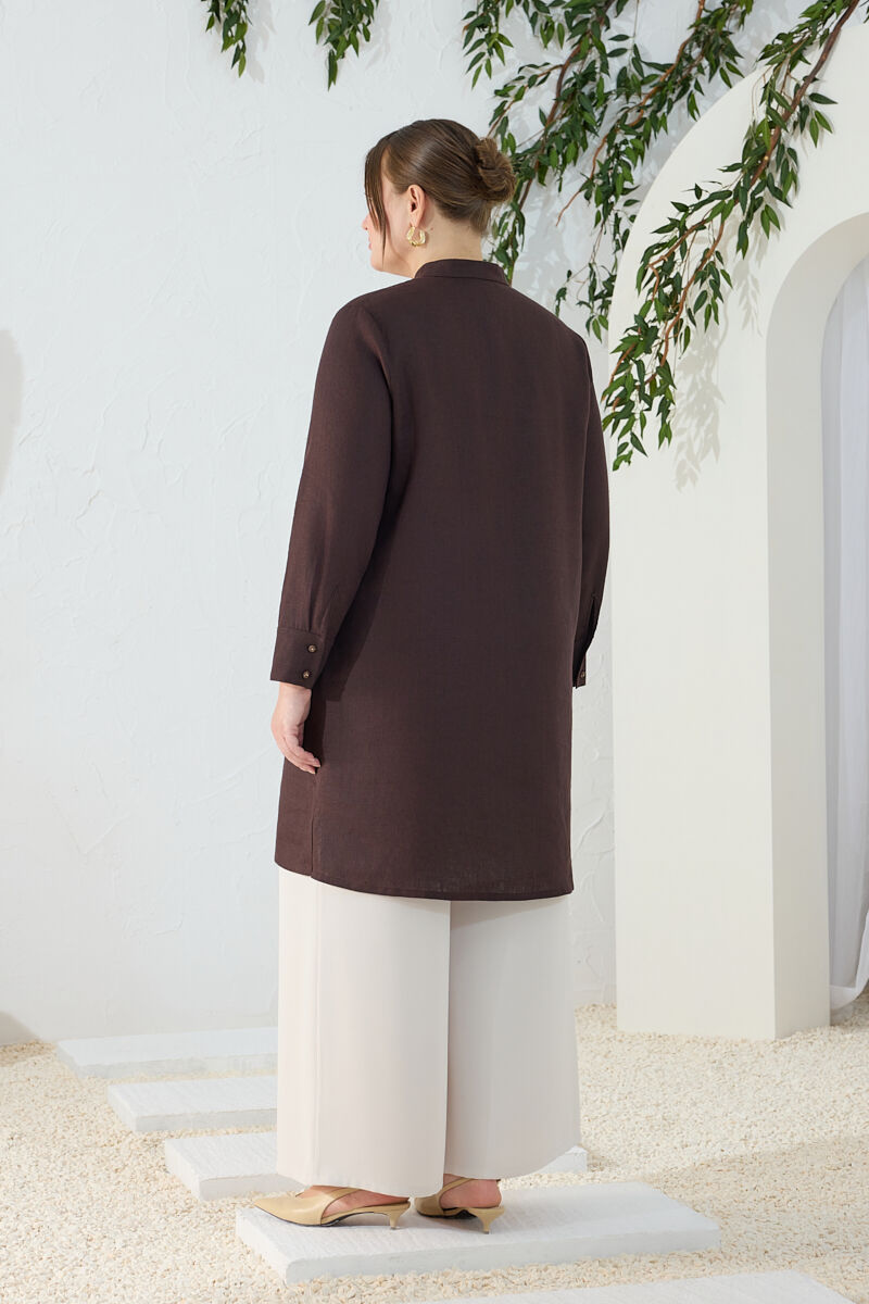Kahverengi Yakası Fermuarlı Keten Tencel Tunik
