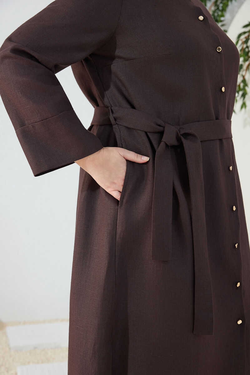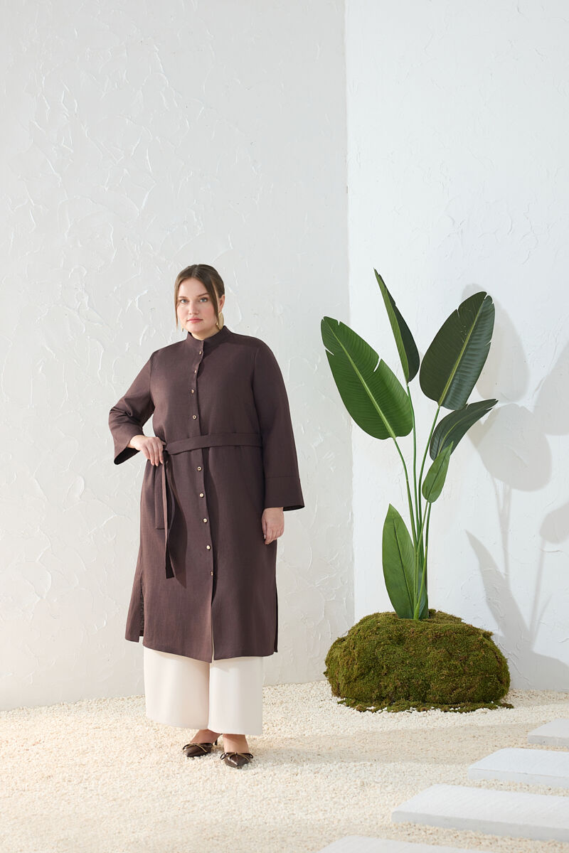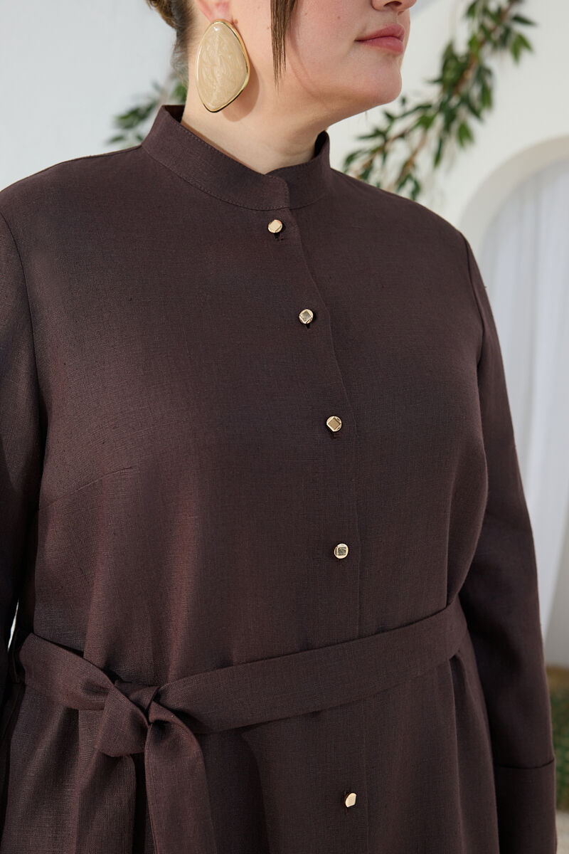 Kahverengi Yakası Fermuarlı Keten Tencel Tunik