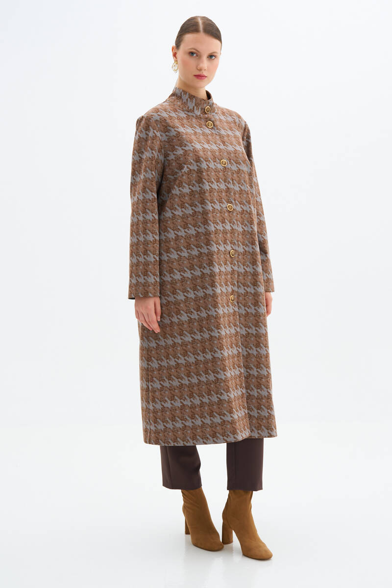 Kahverengi Kazayağı Desenli Spor Pardösü