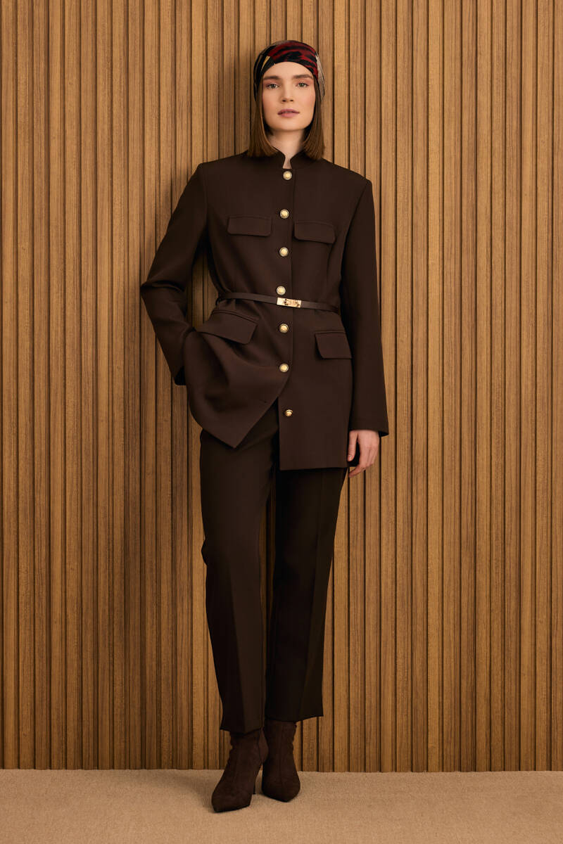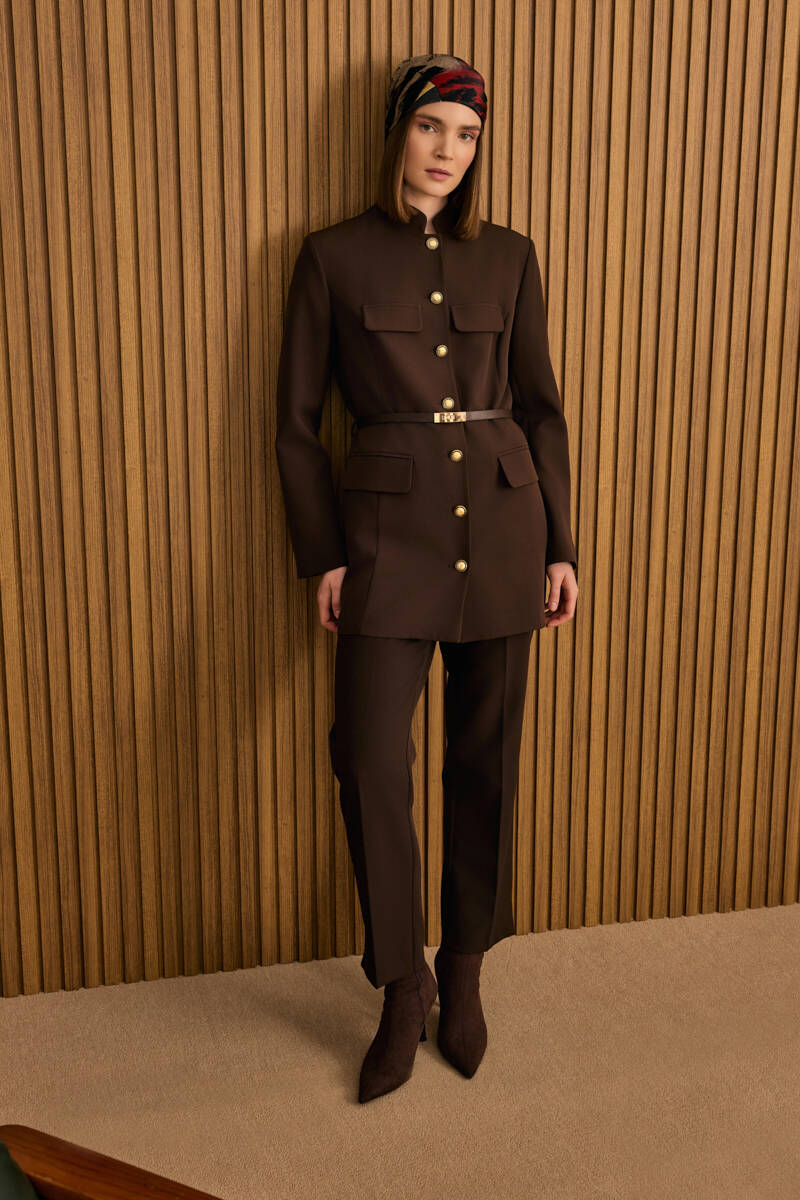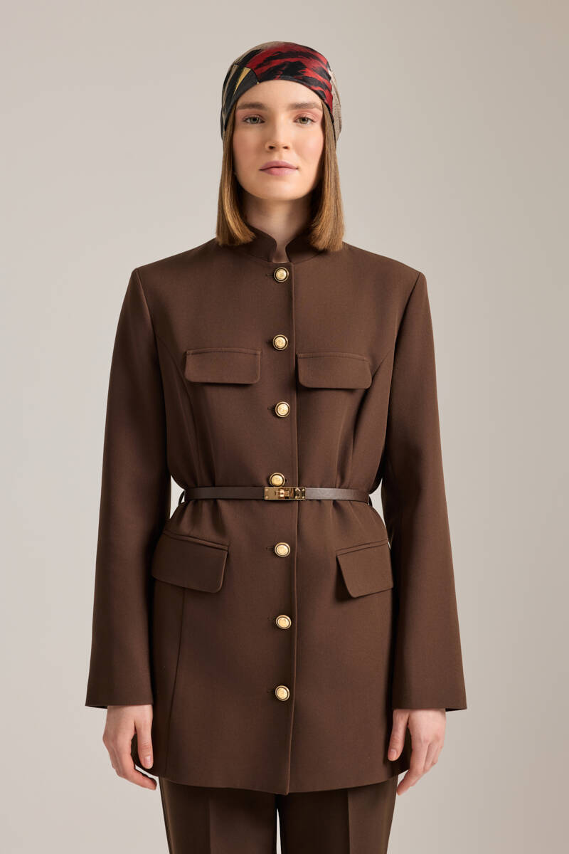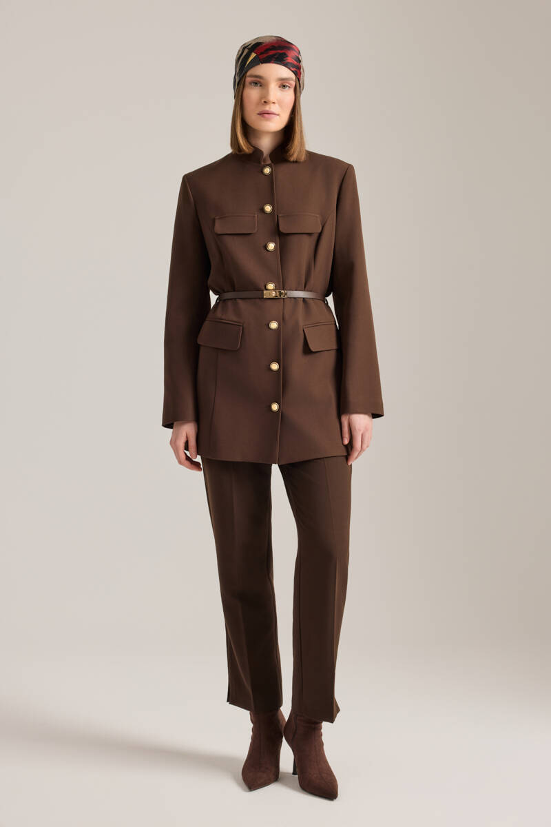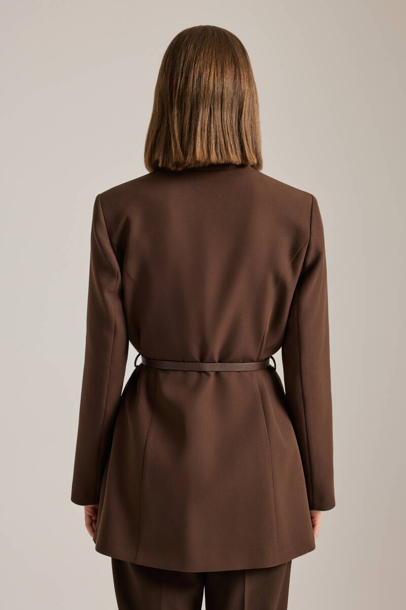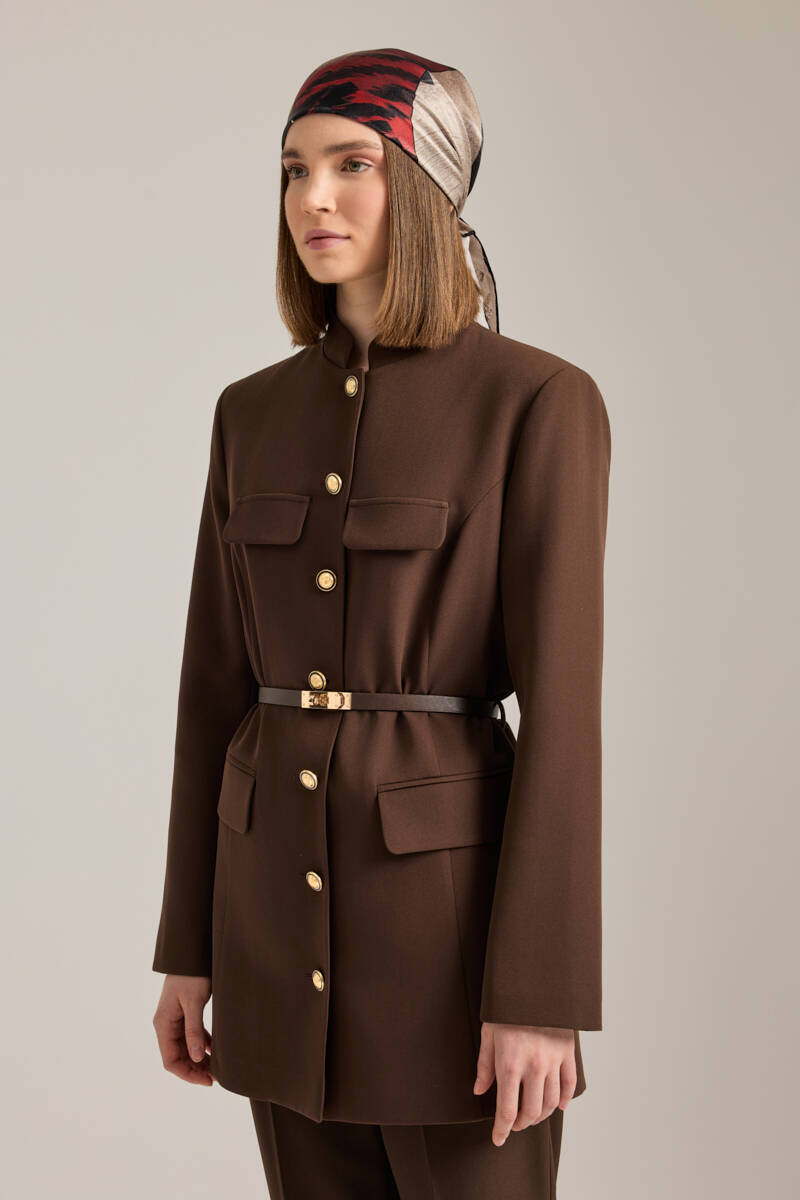 Kahverengi Kemer Aksesuarlı Hakim Yaka Ceket