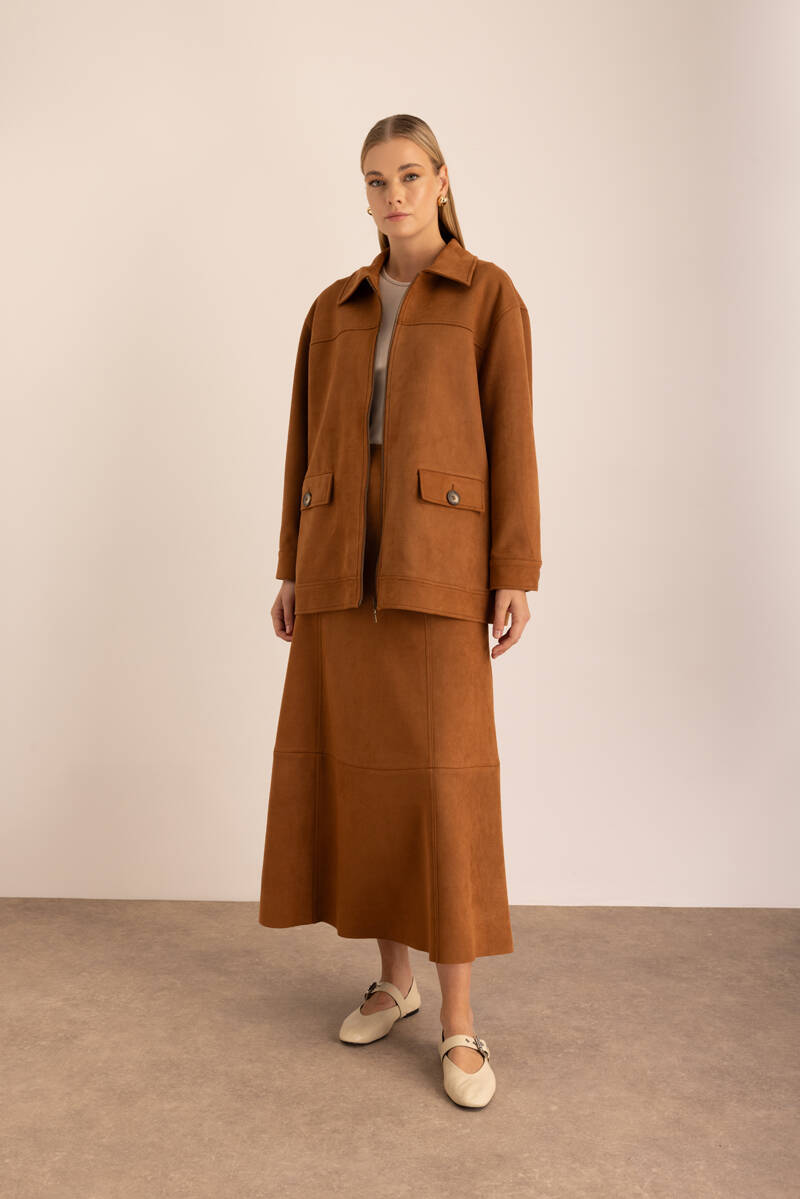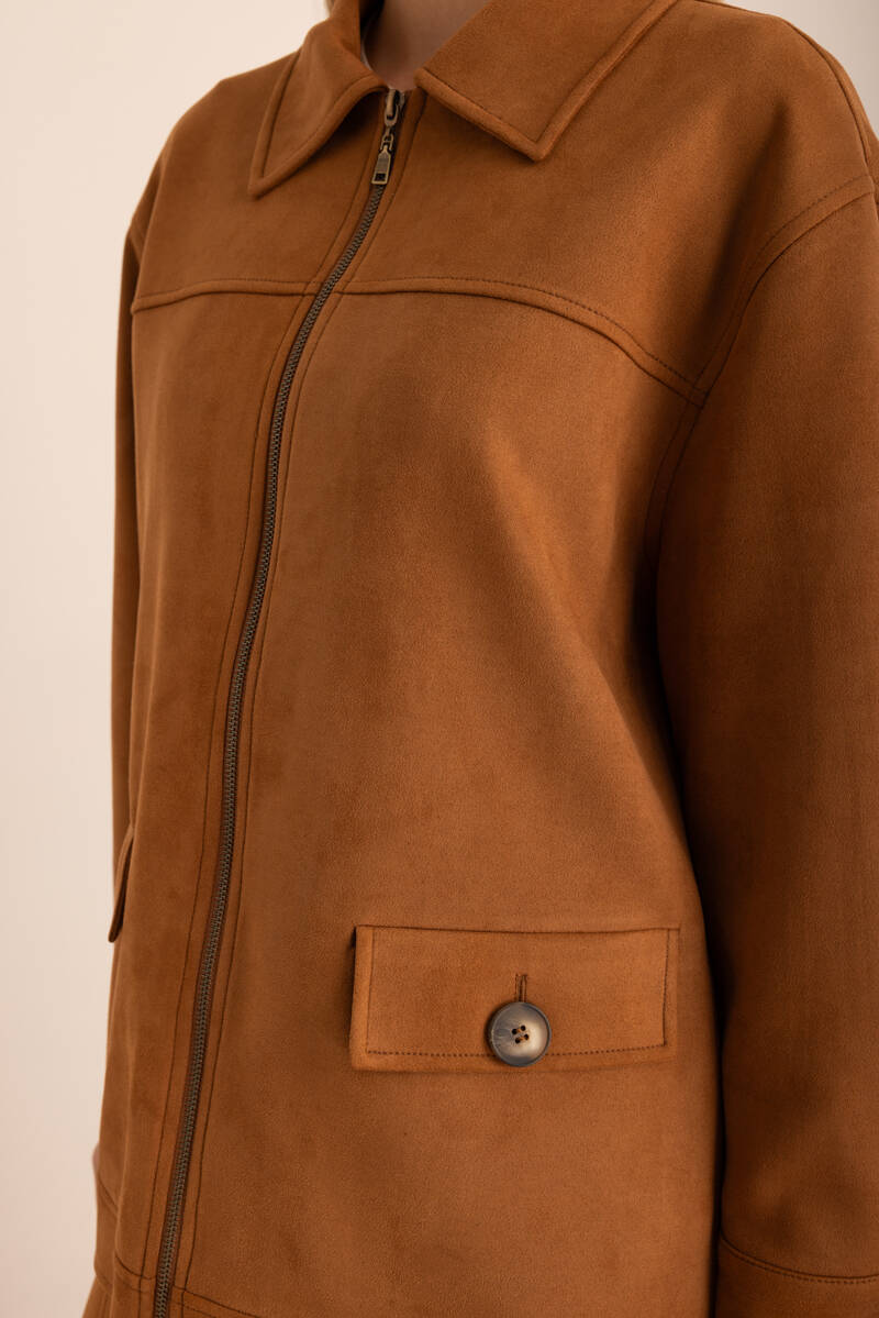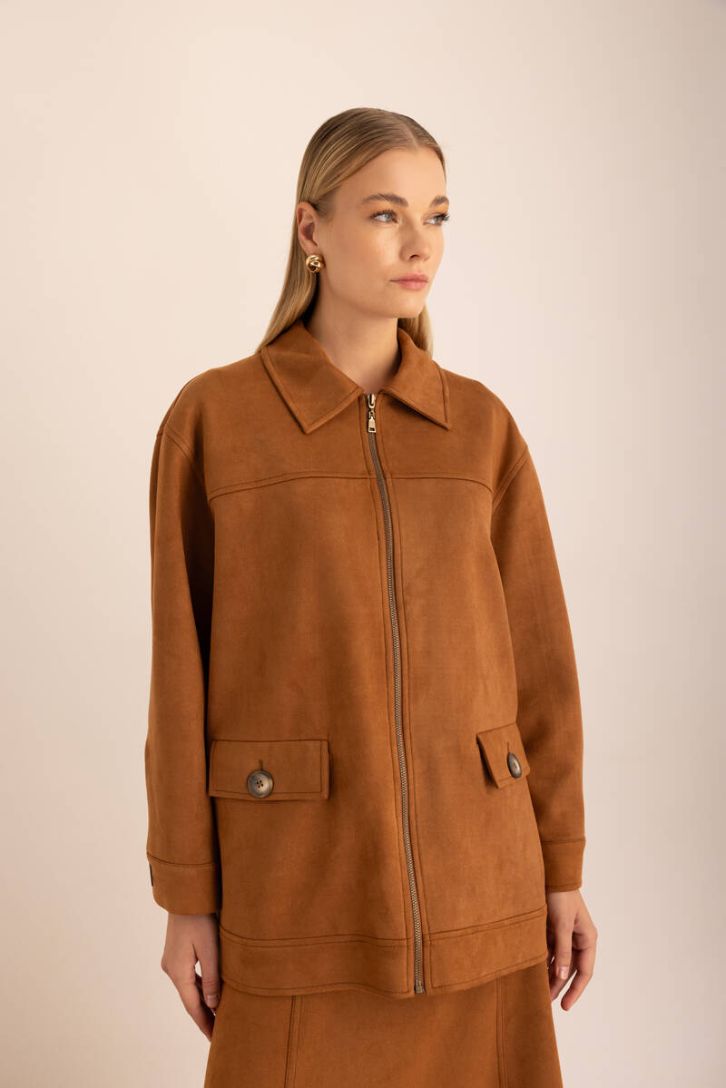 Kahverengi Fermuarlı Süet Kutu Ceket