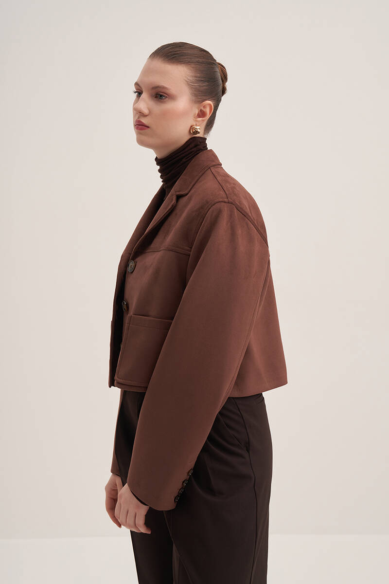Ekru Yaprak Desenli Keten Kısa Ceket