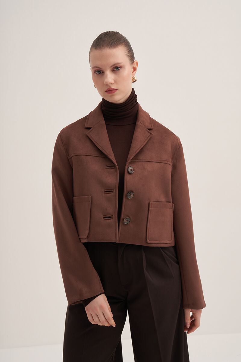 Ekru Yaprak Desenli Keten Kısa Ceket