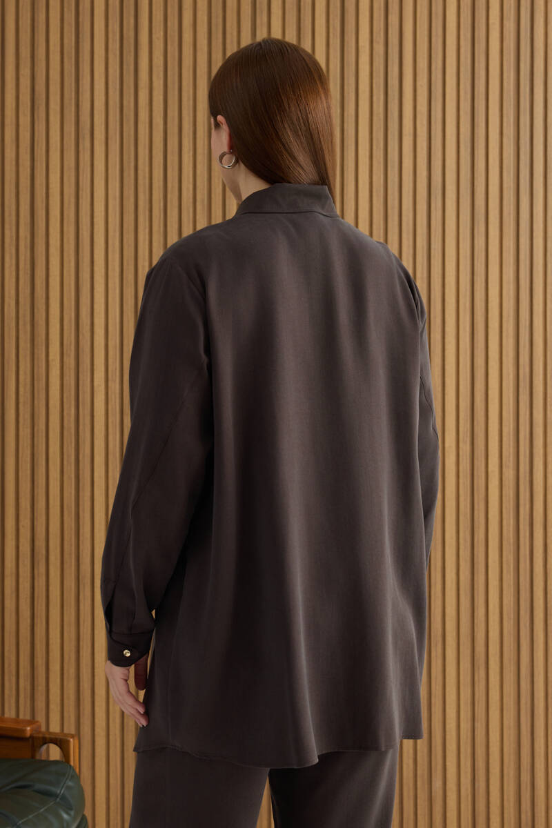 Kahverengi Yakası Fermuarlı Keten Tencel Tunik