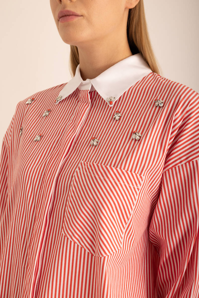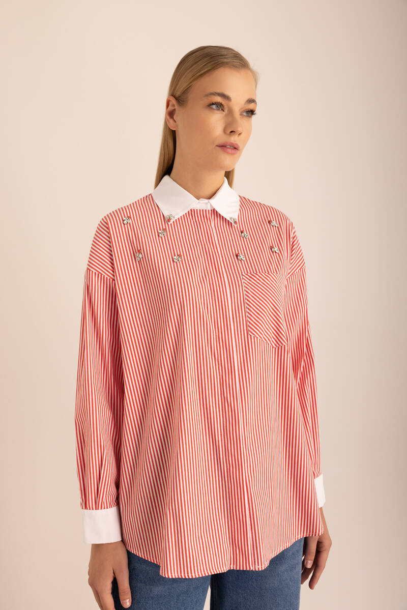 Kırmızı Çizgili Cotton Taş İşlemeli Gömlek