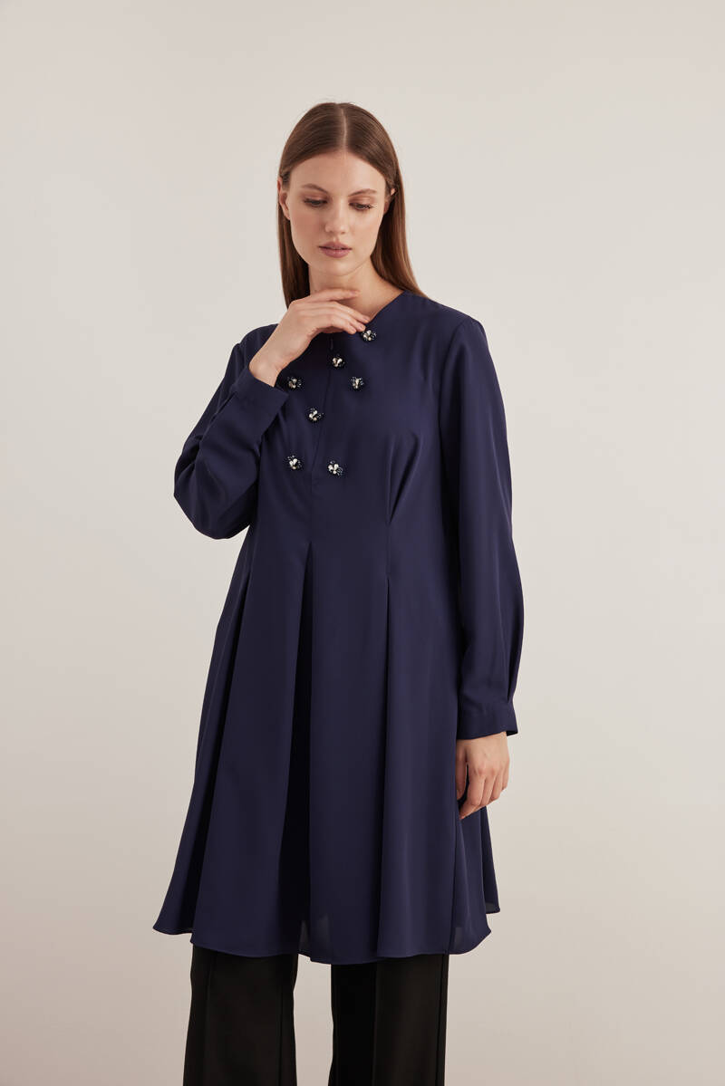 Mavi Kemeri İşlemeli Dökümlü Tunik