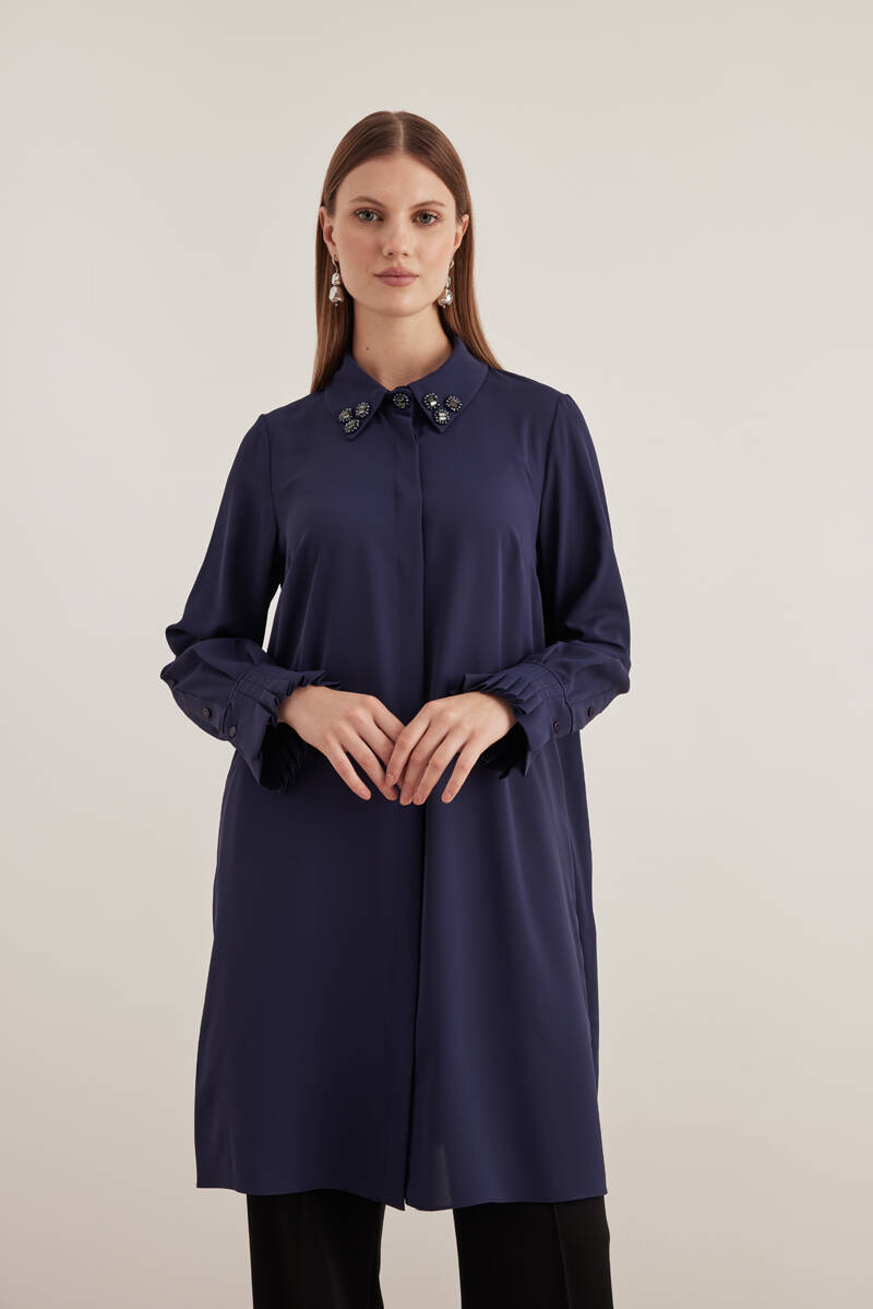 Mavi Kemeri İşlemeli Dökümlü Tunik