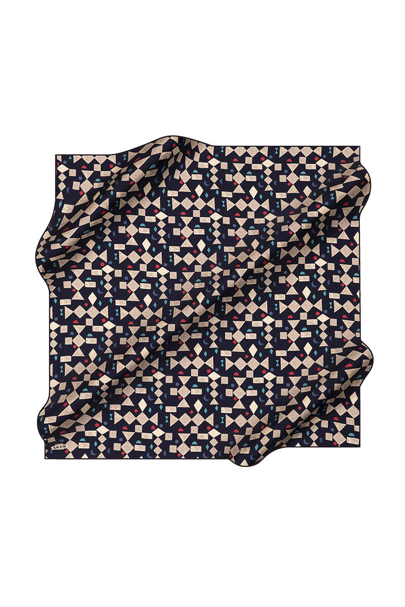 Geometrik Desenli 90X90 İpek Krep Saten Eşarp