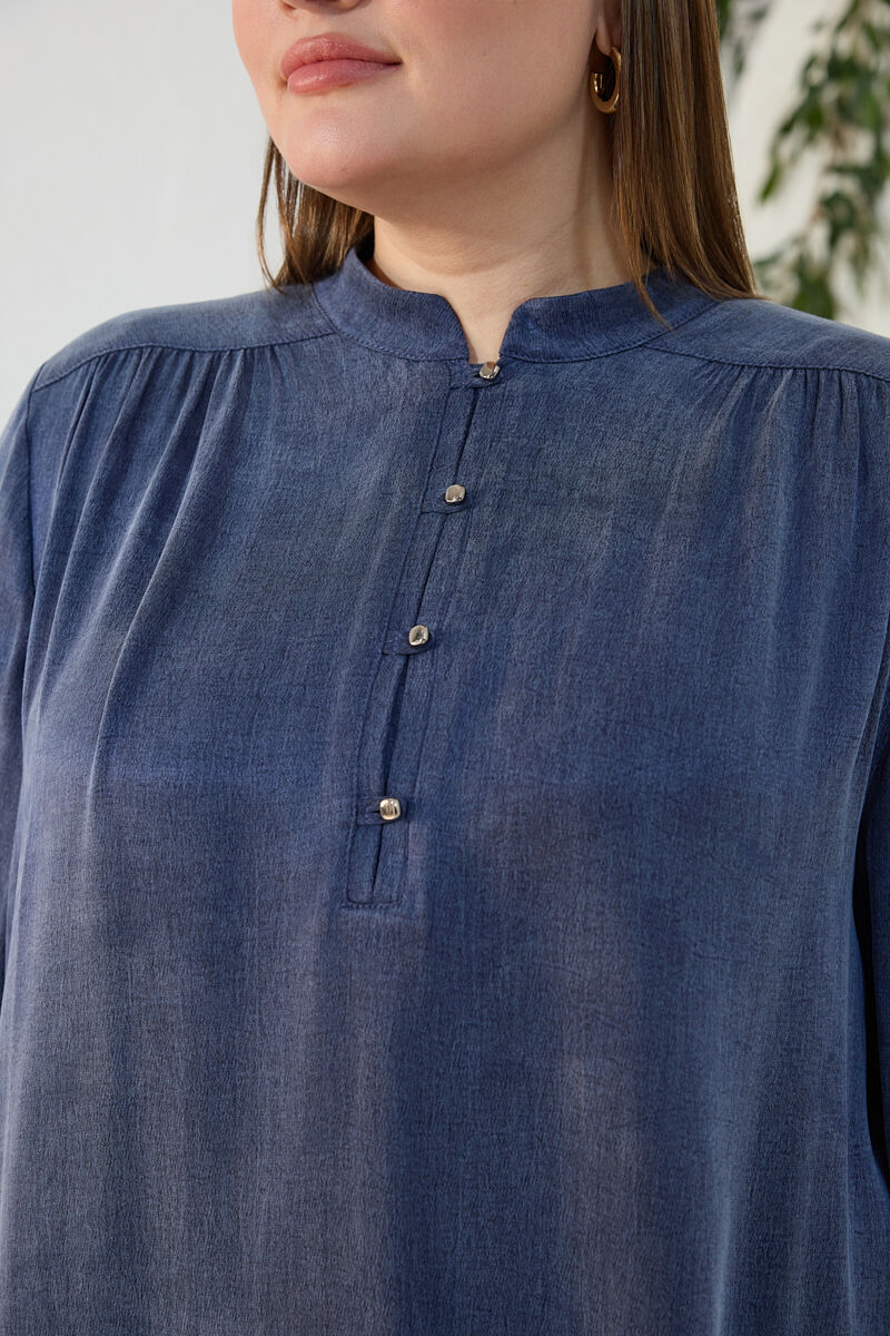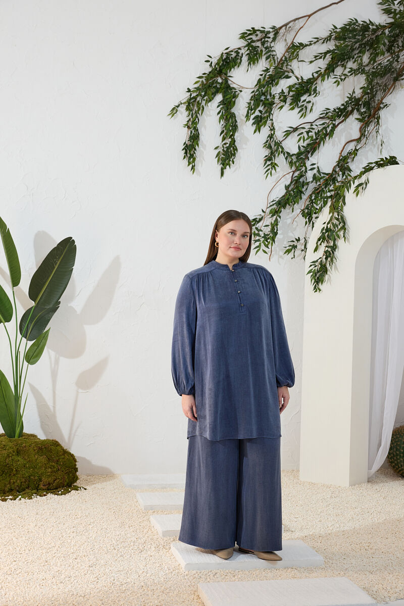Mavi Kemeri İşlemeli Dökümlü Tunik