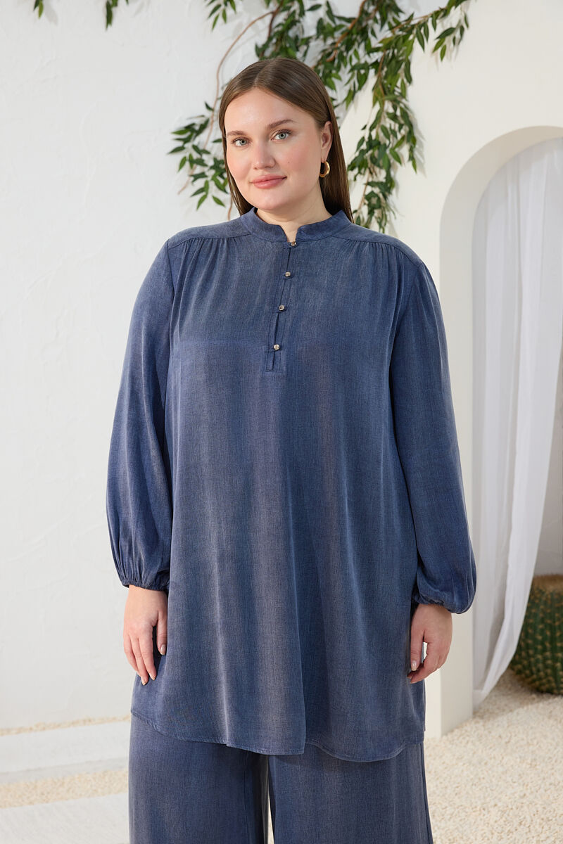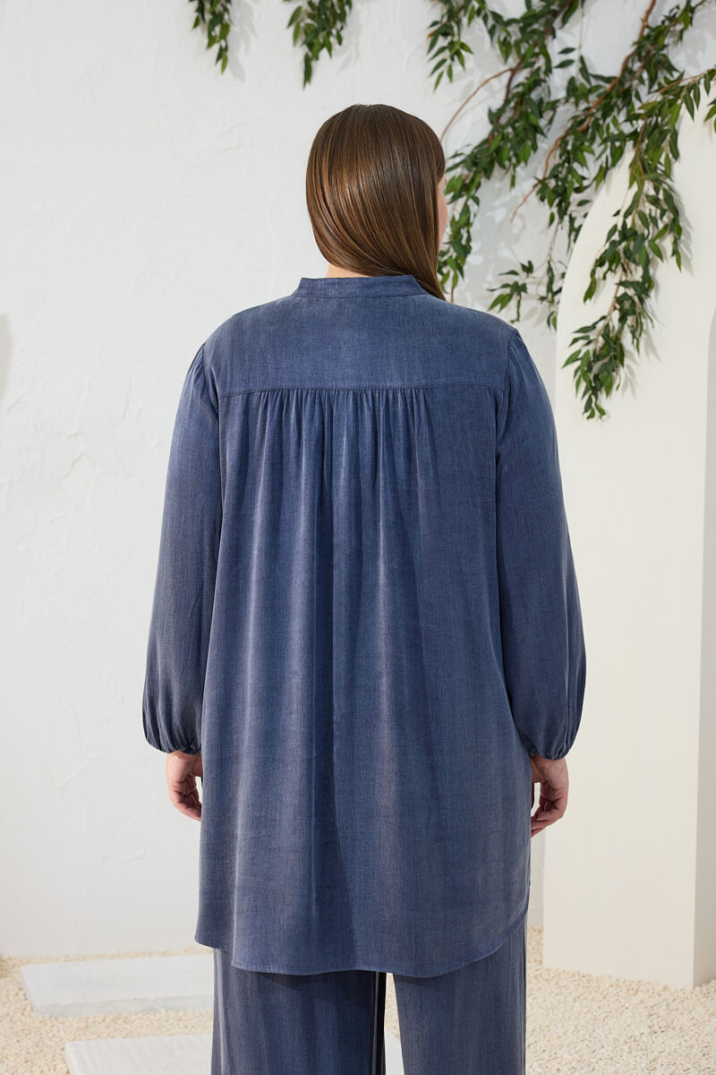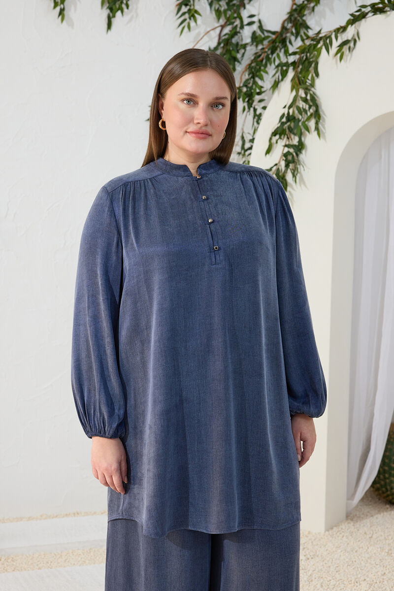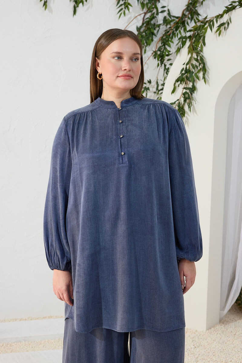 Lacivert Büzgü Lastik Detaylı Tunik