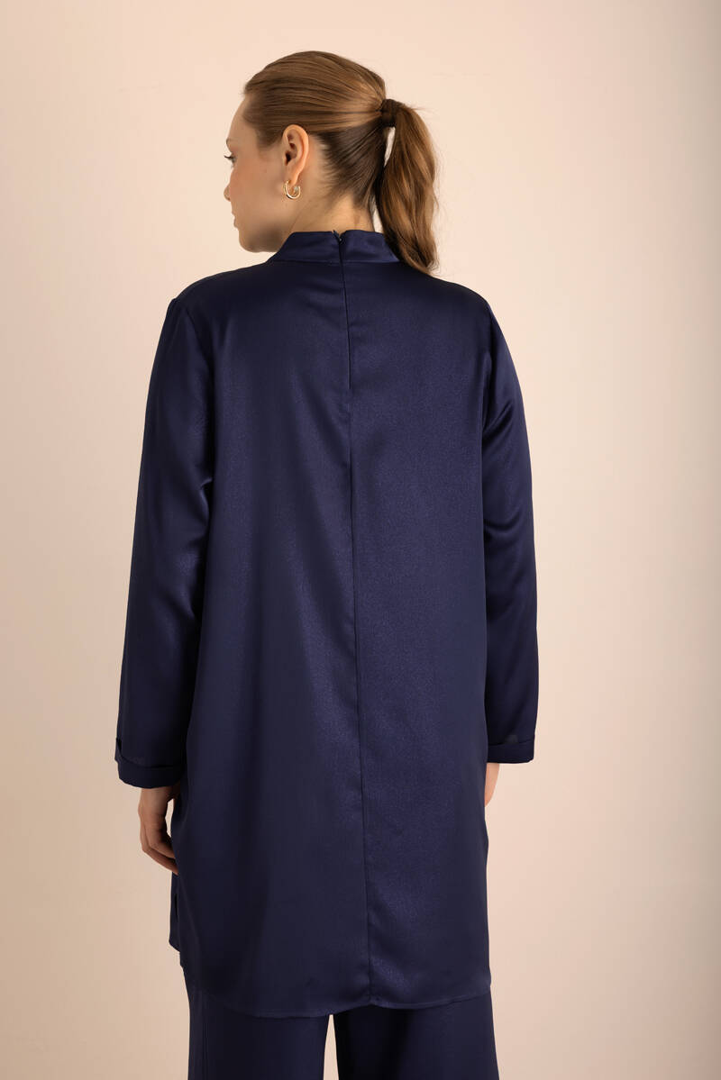 İndigo Yakası Fermuarlı Keten Tencel Tunik