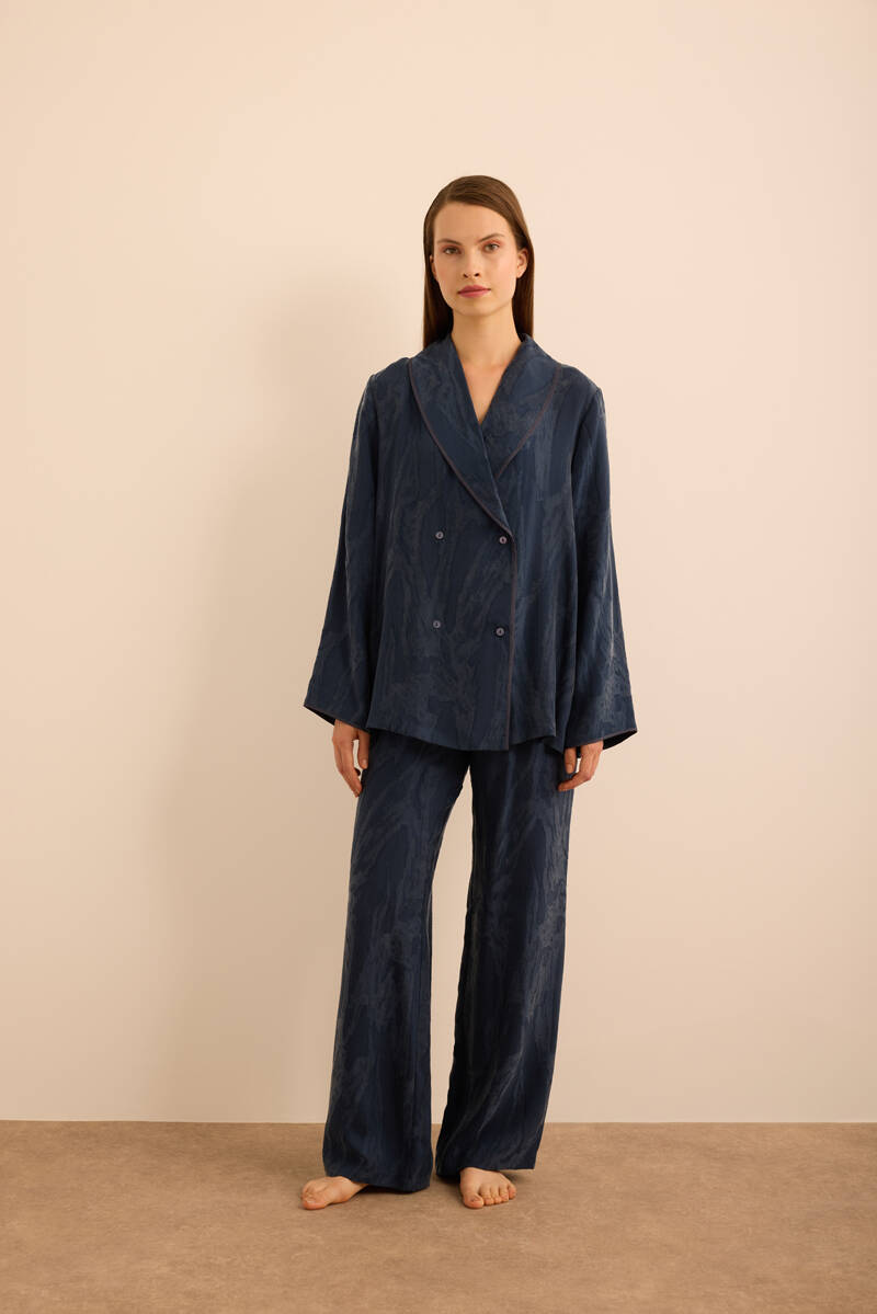 Lacivert Çiçek Dokulu Tencel, Beli Lastikli Pijama Altı