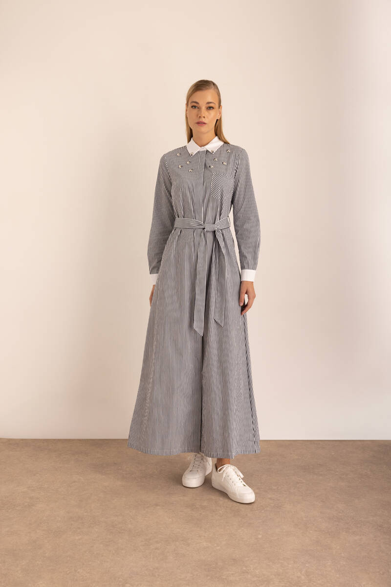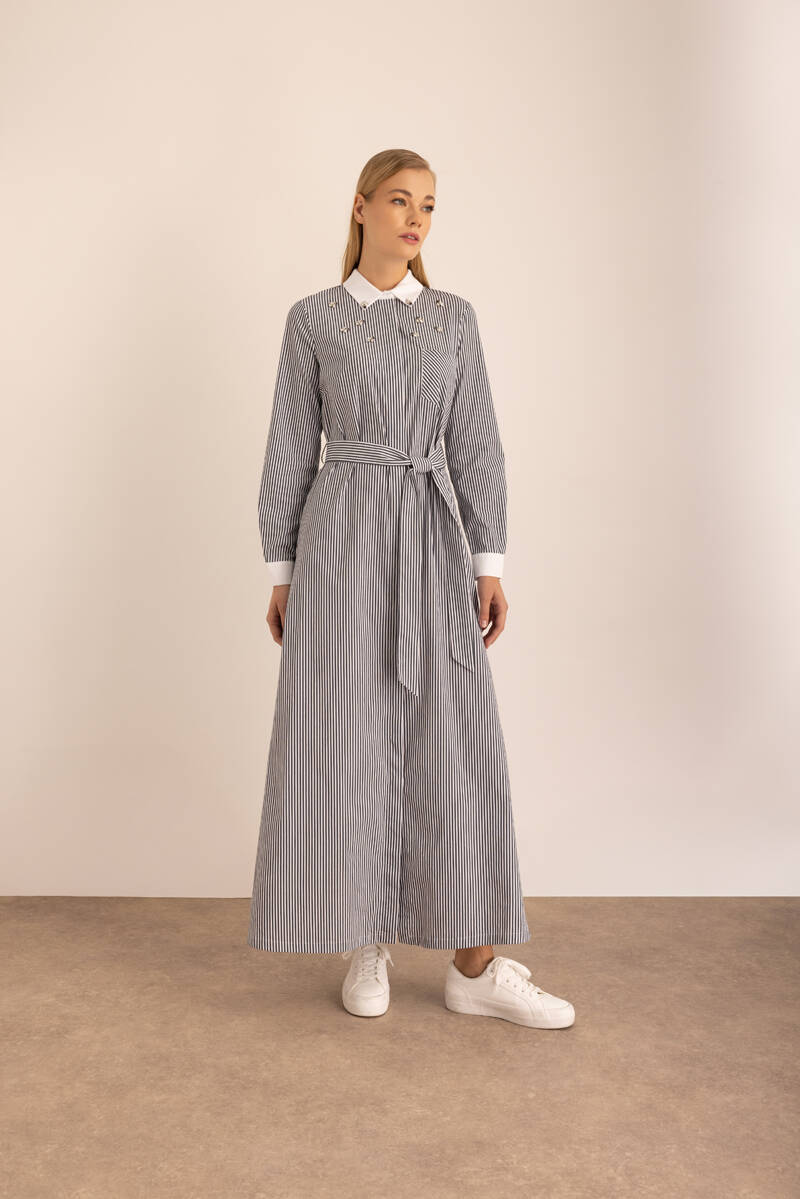 Lacivert Çizgili Cotton İşleme Detaylı Elbise