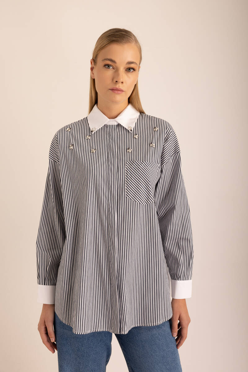 Lacivert Çizgili Cotton Taş İşlemeli Gömlek