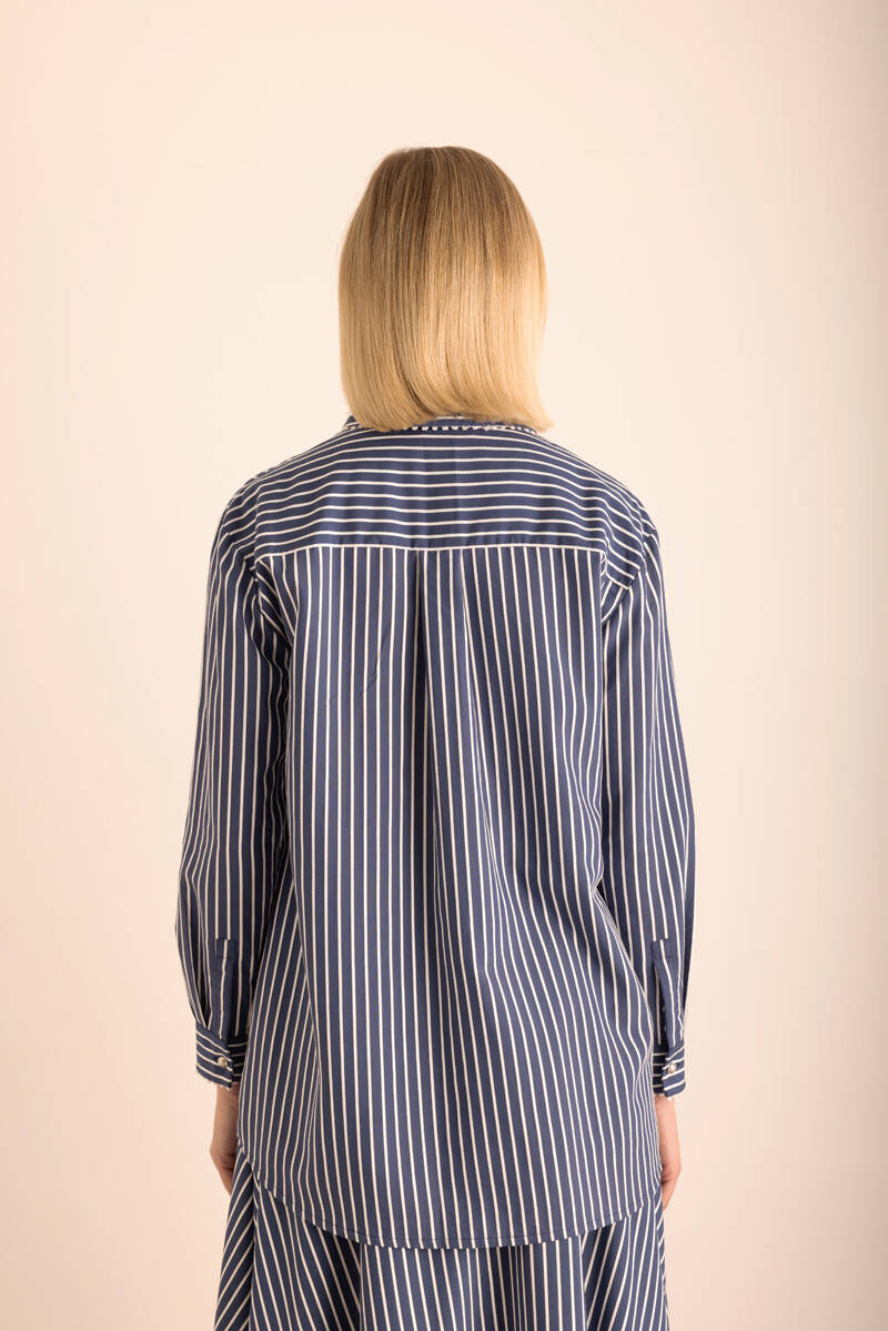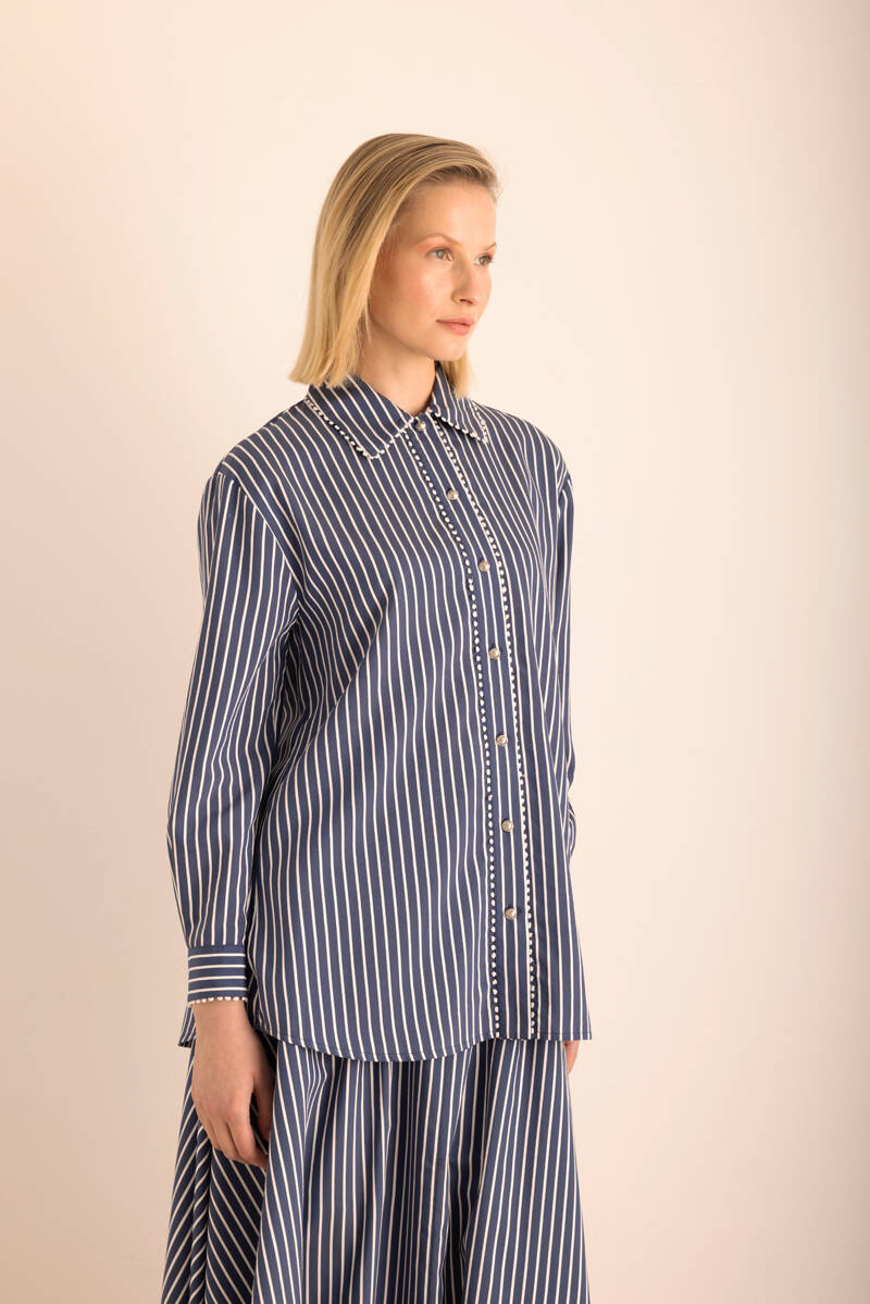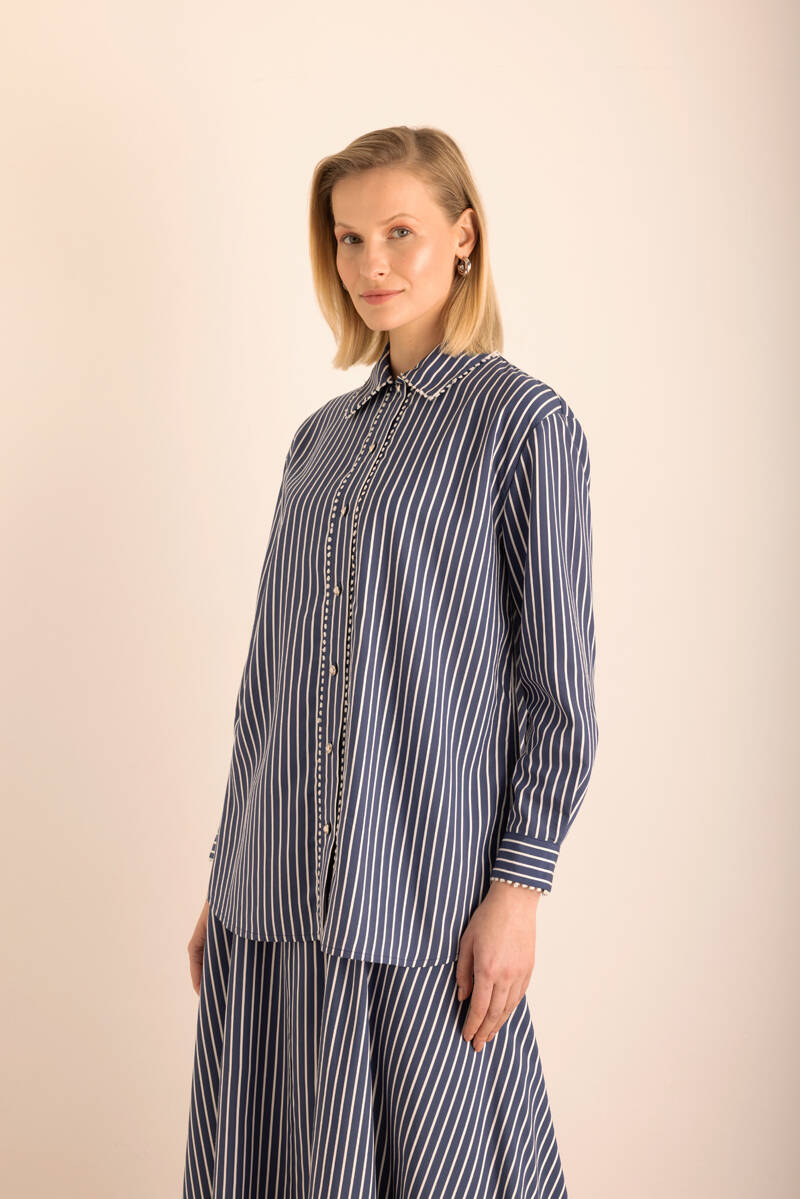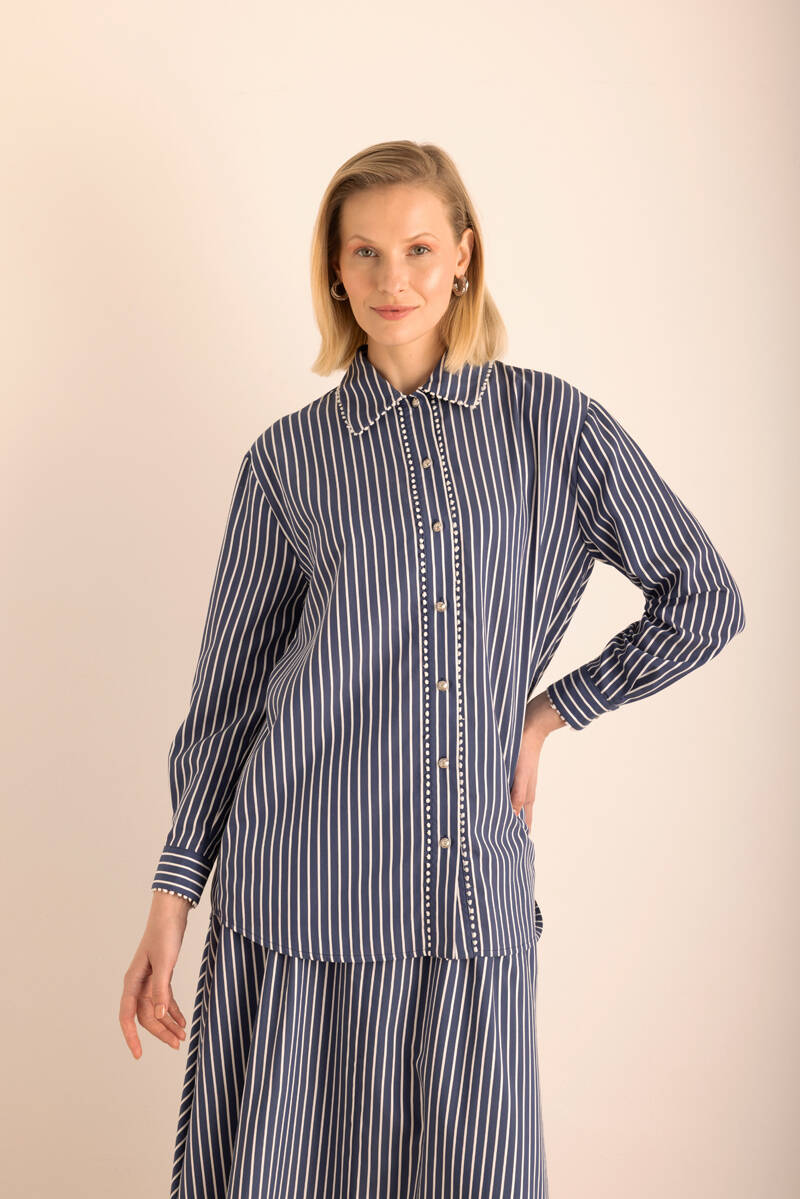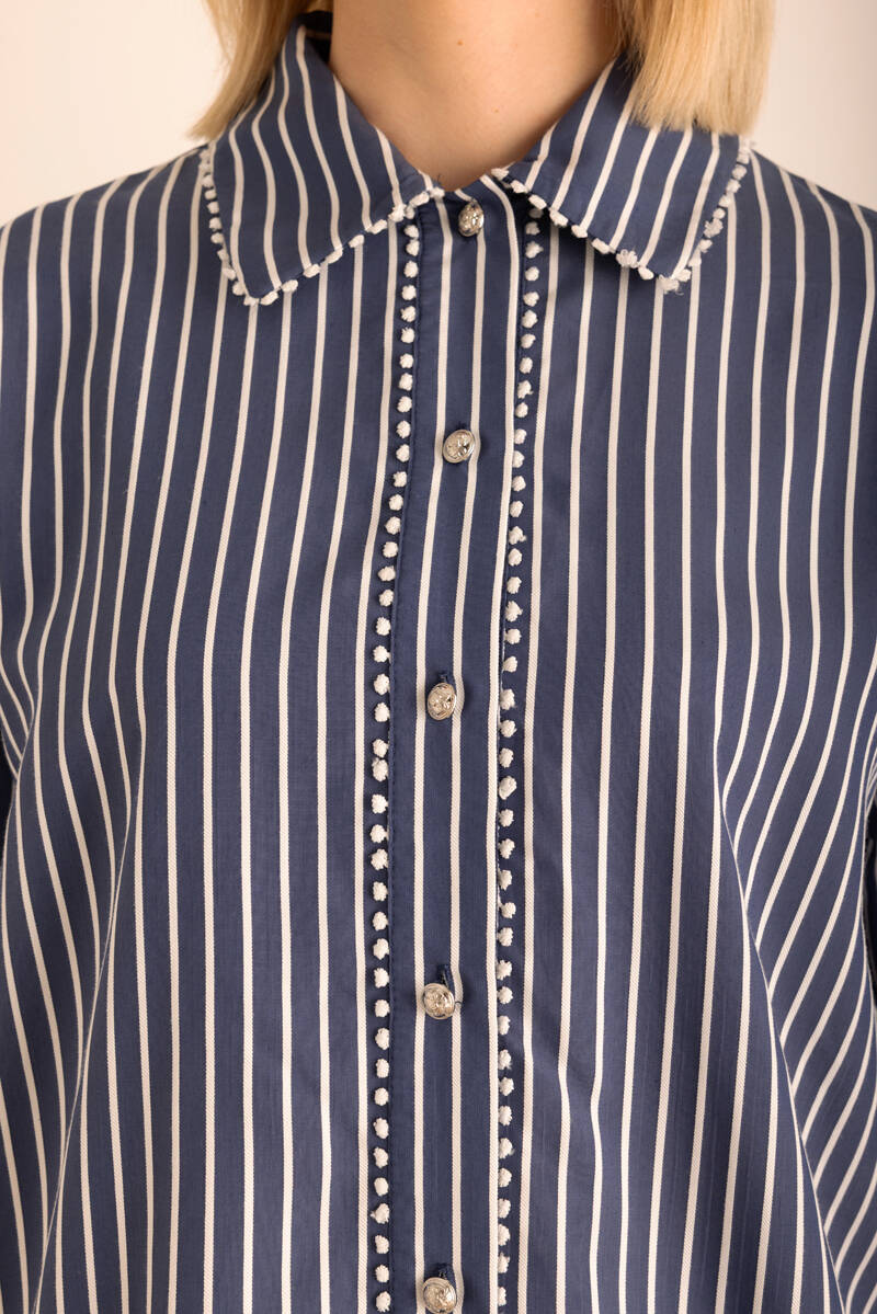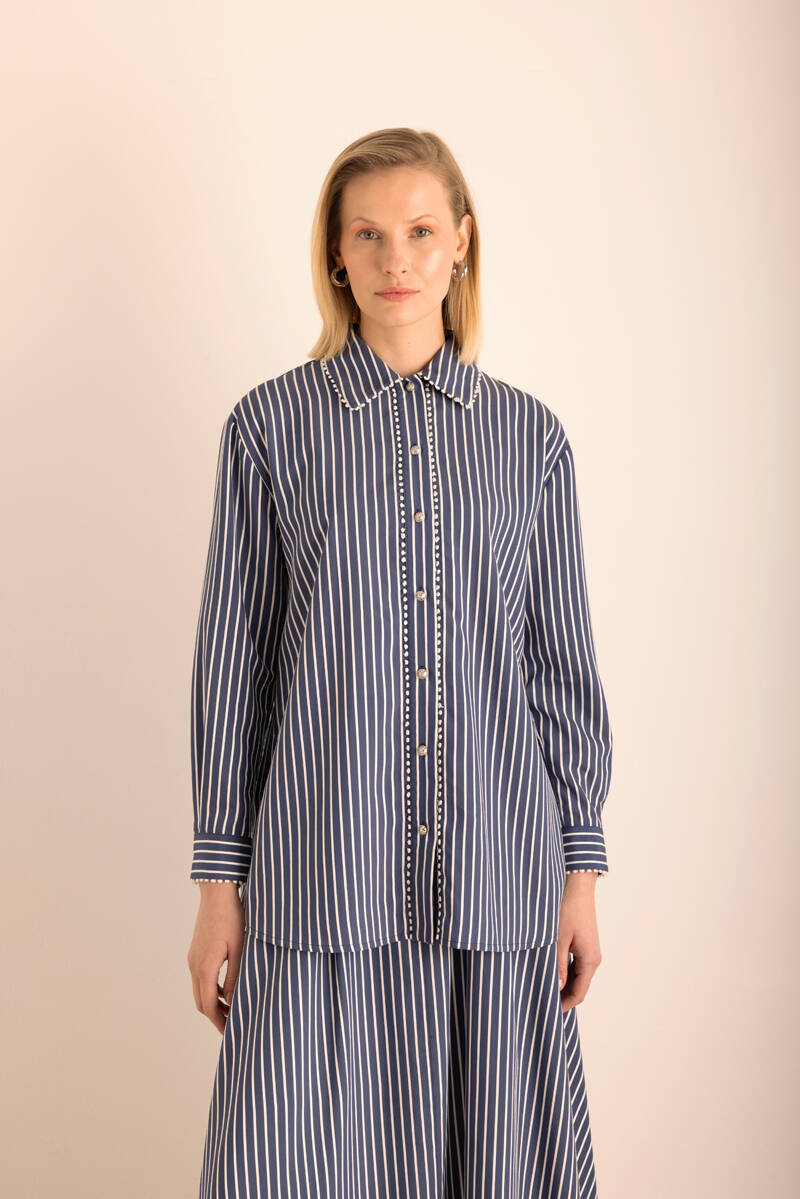 Lacivert Çizgili , Top Şerit Aksesuar Detaylı Viscon Bluz