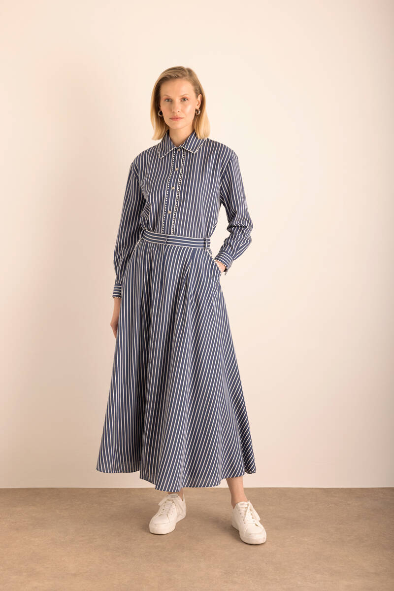 Lacivert Çizgili Top Şerit Aksesuar Detaylı Viscon Etek