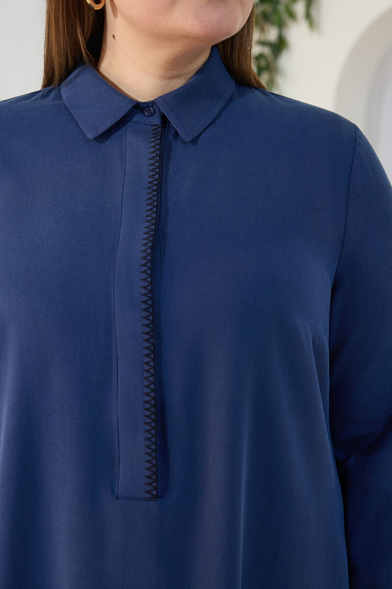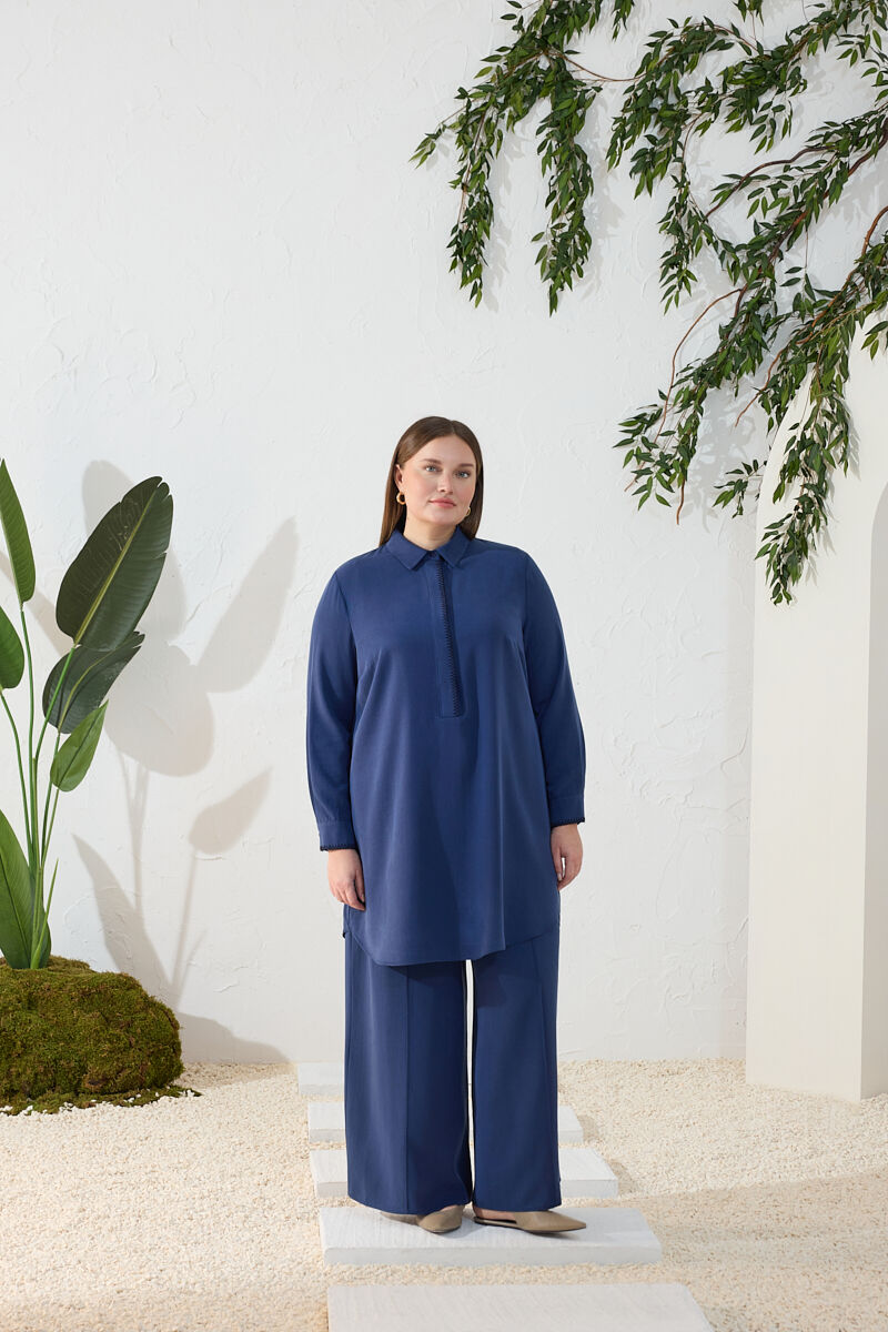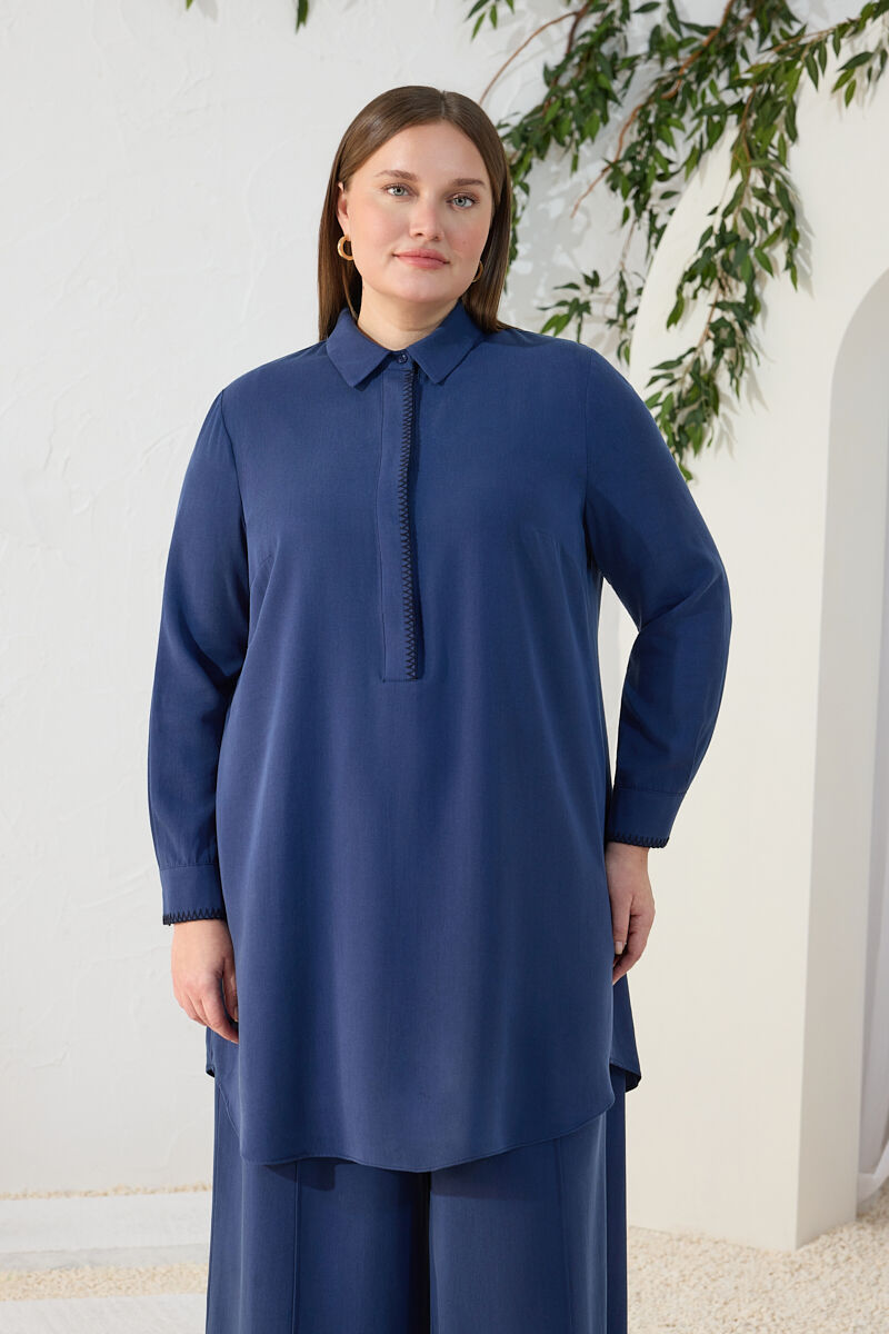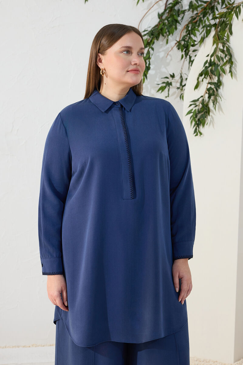 İndigo Yakası Fermuarlı Keten Tencel Tunik
