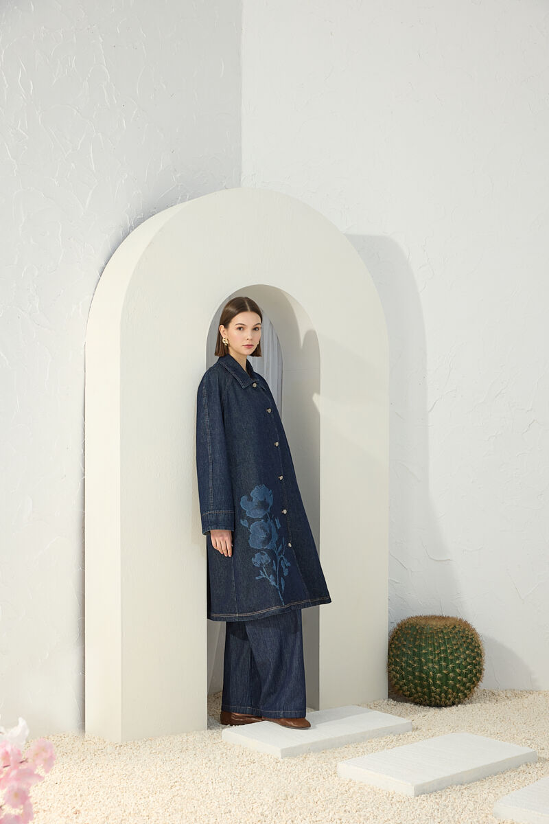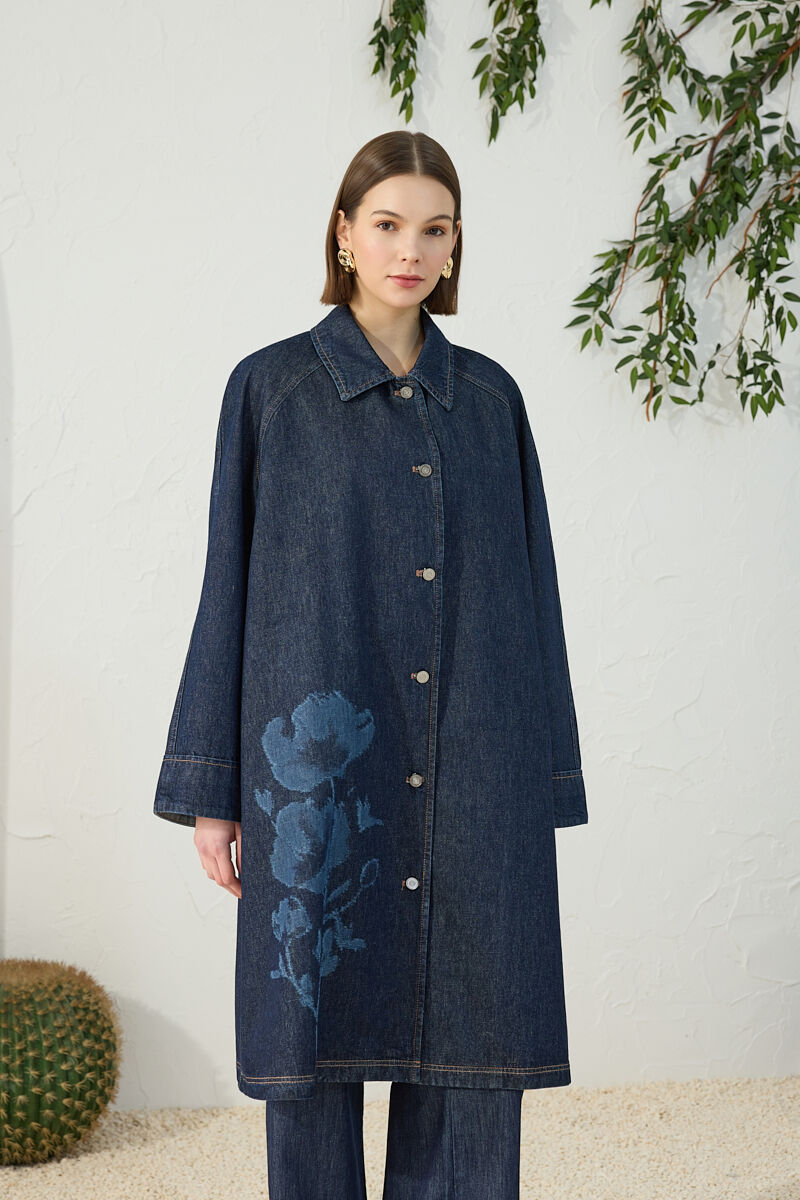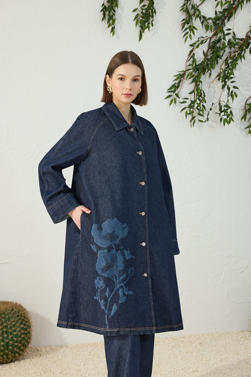 Ekru Yaprak Desenli Keten Yandan Bağlamalı Kimono