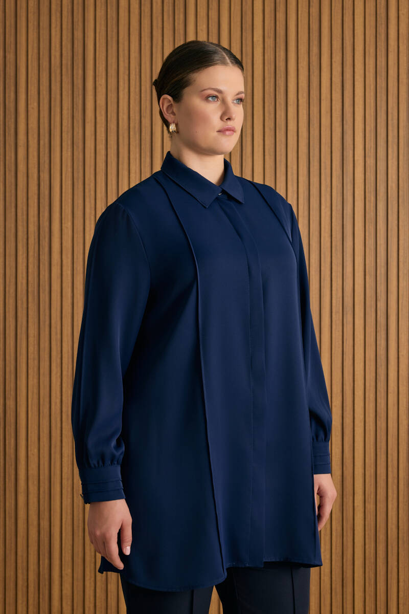İndigo Yakası Fermuarlı Keten Tencel Tunik
