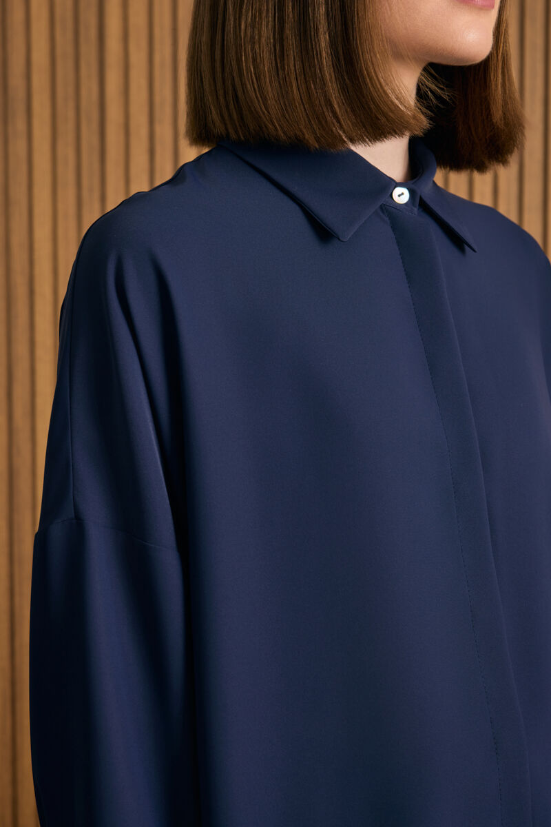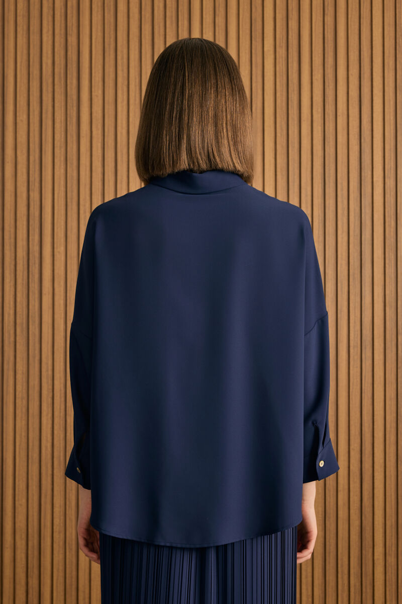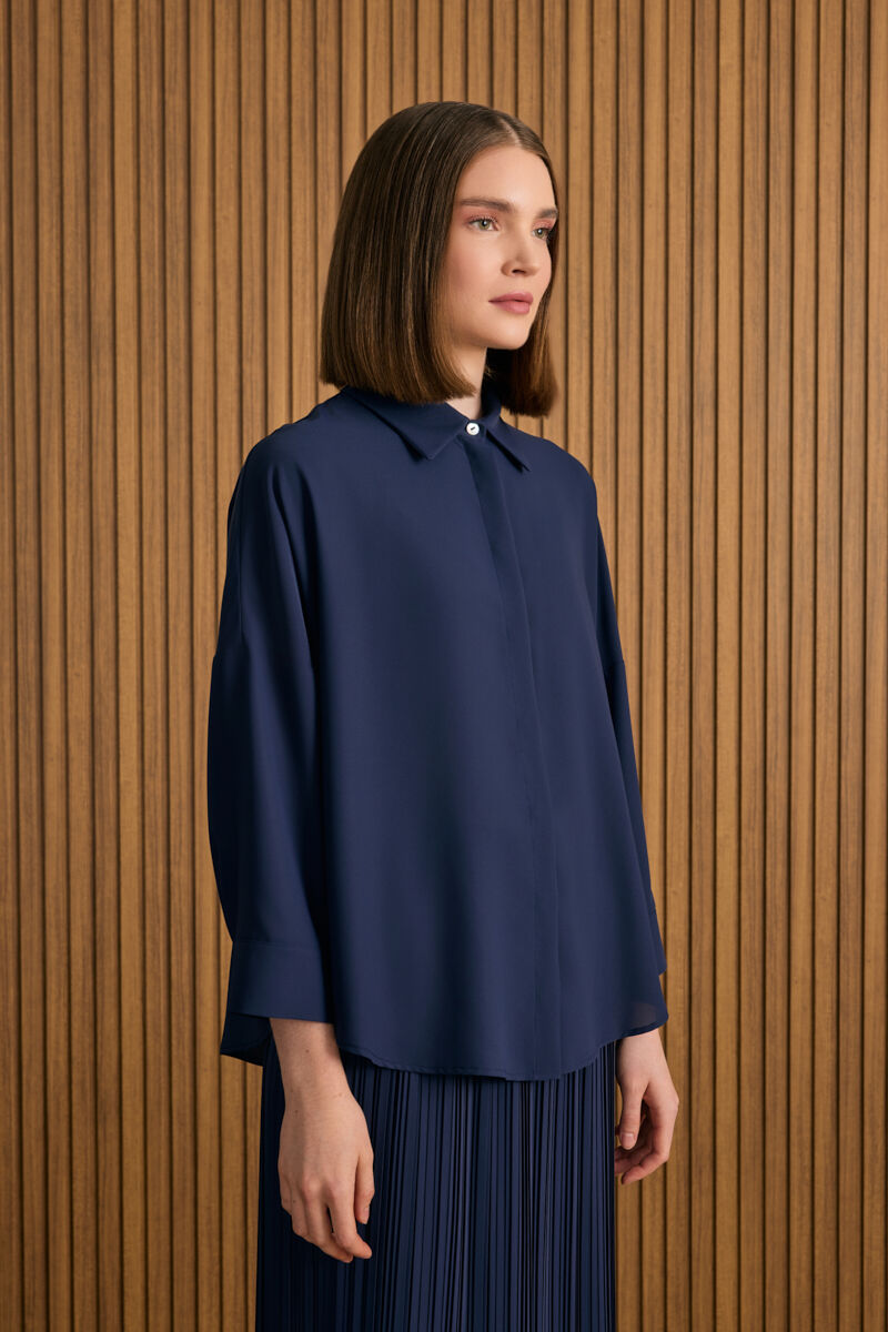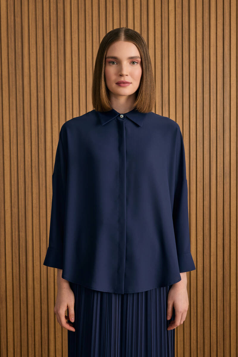 Lacivert Yandan Pili ve İşleme Detaylı Dokuma Bluz