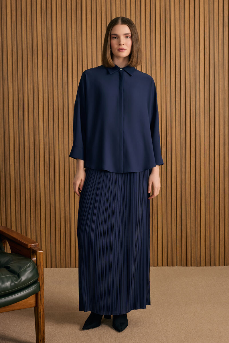 Saks Ön Göğüs Kısmı Pile ve Parça Detaylı Bluz