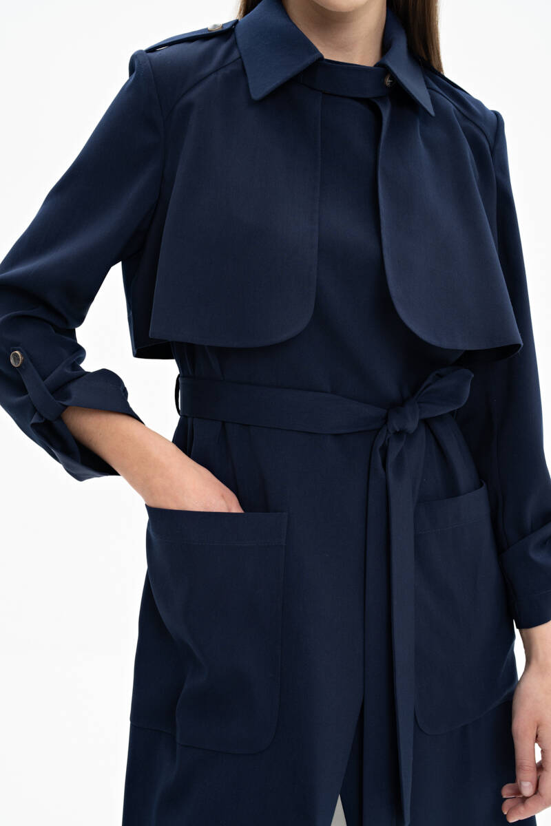 Lacivert Dökümlü Yaka Cepli Trençkot
