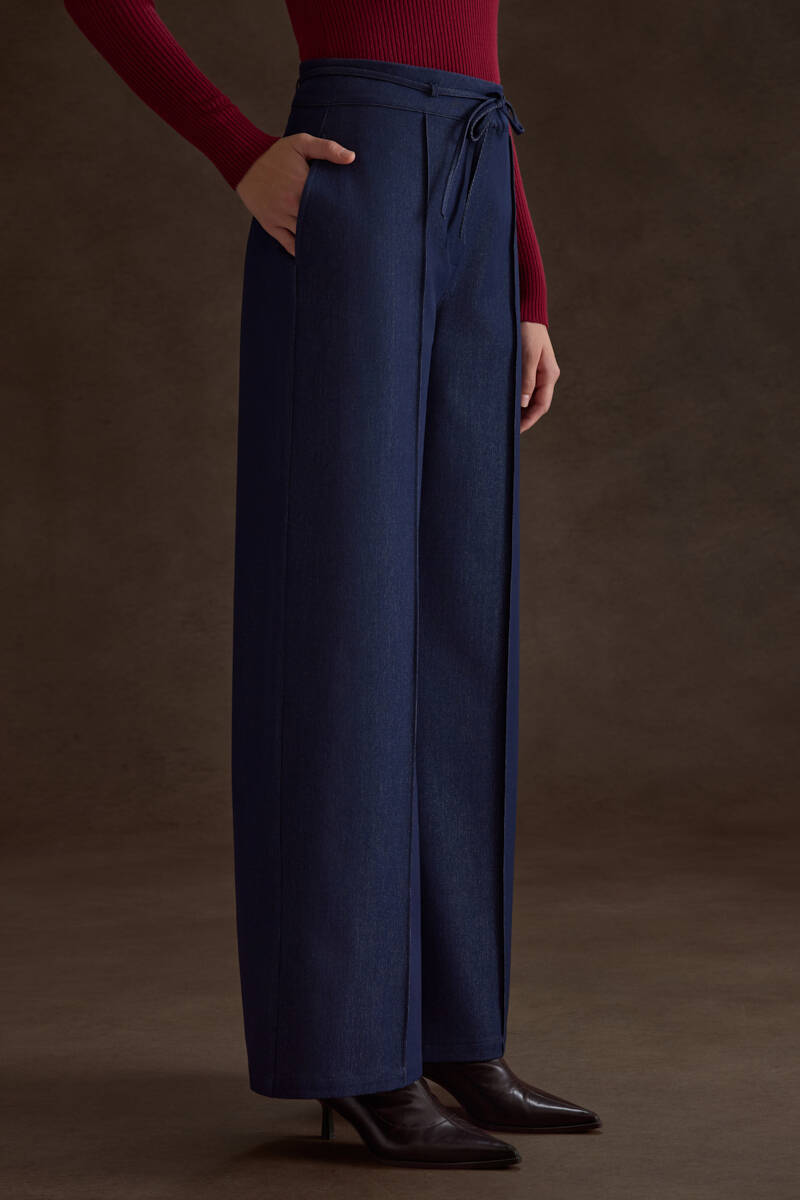 Lacivert Kemeri Bağcık Detaylı Bol Pantolon