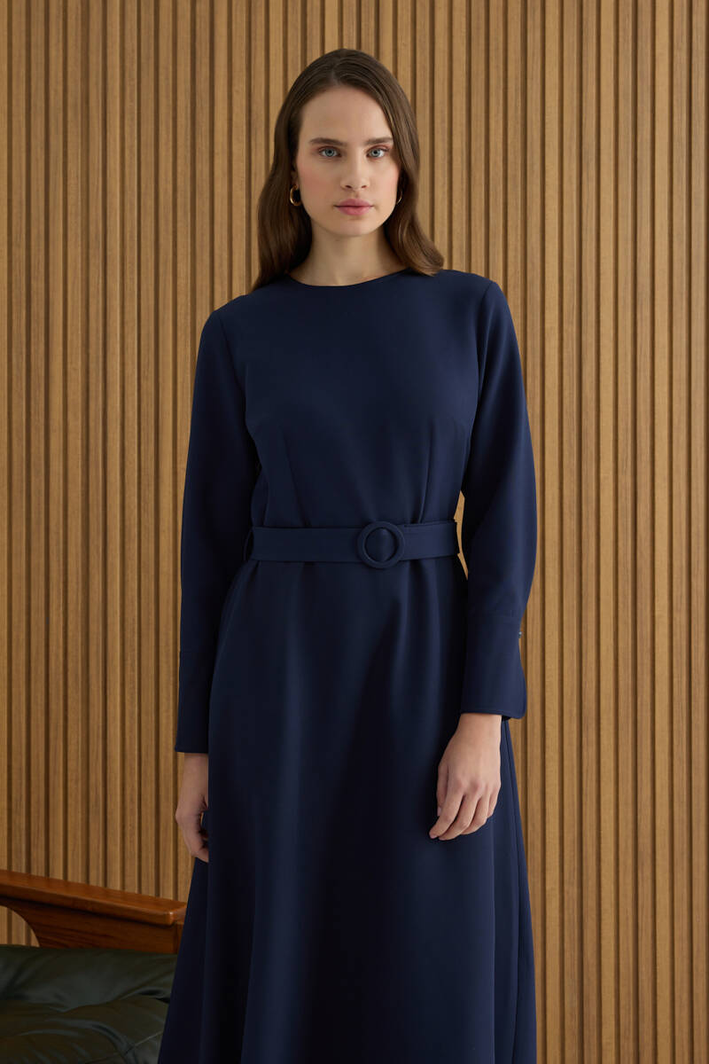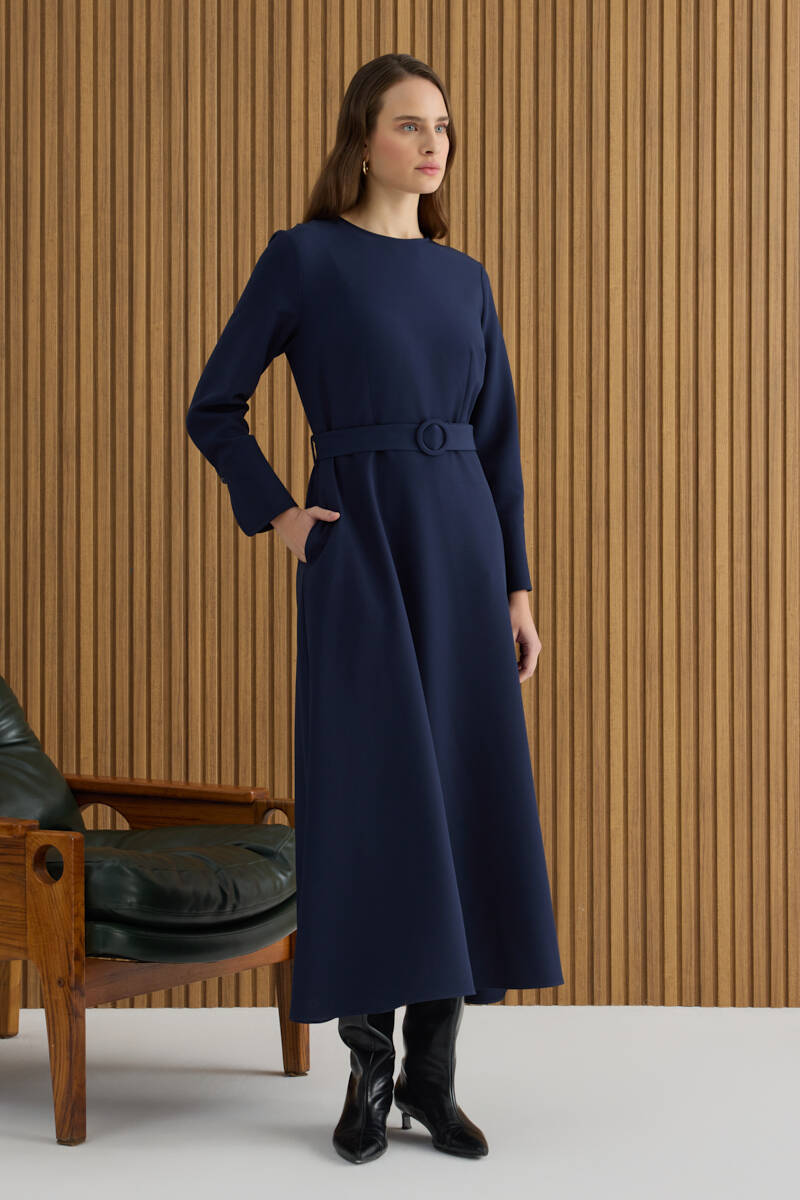 Lacivert Kemerli Evaze Elbise