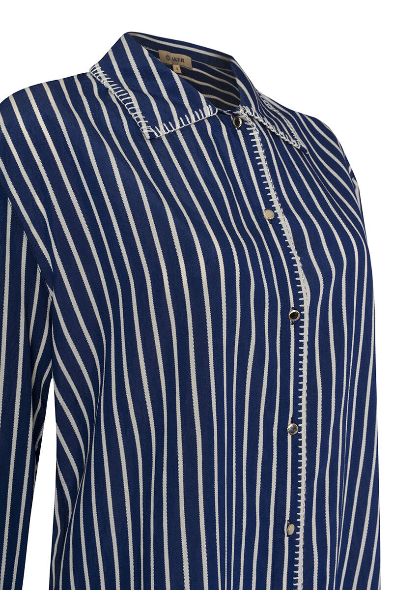 Lacivert Tığ İşi İşleme Detaylı Çizgili Uzun Bluz