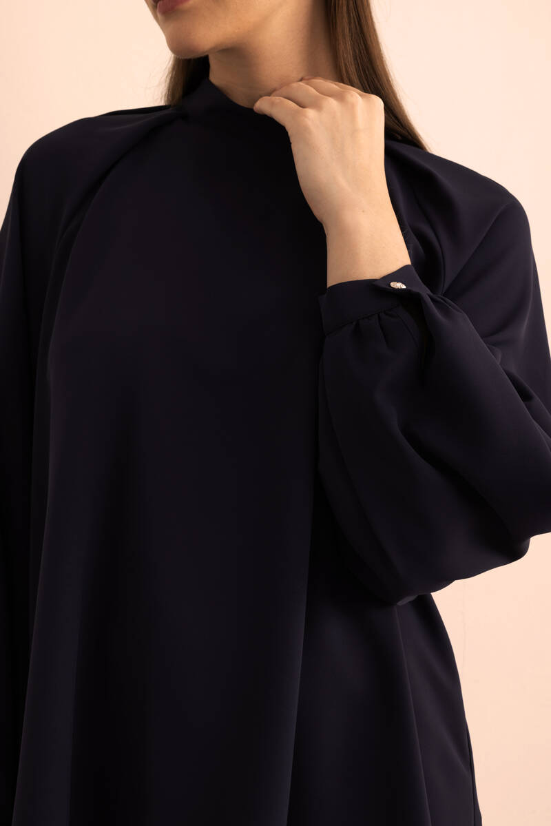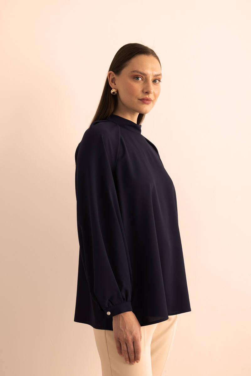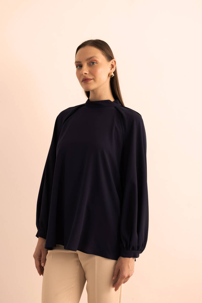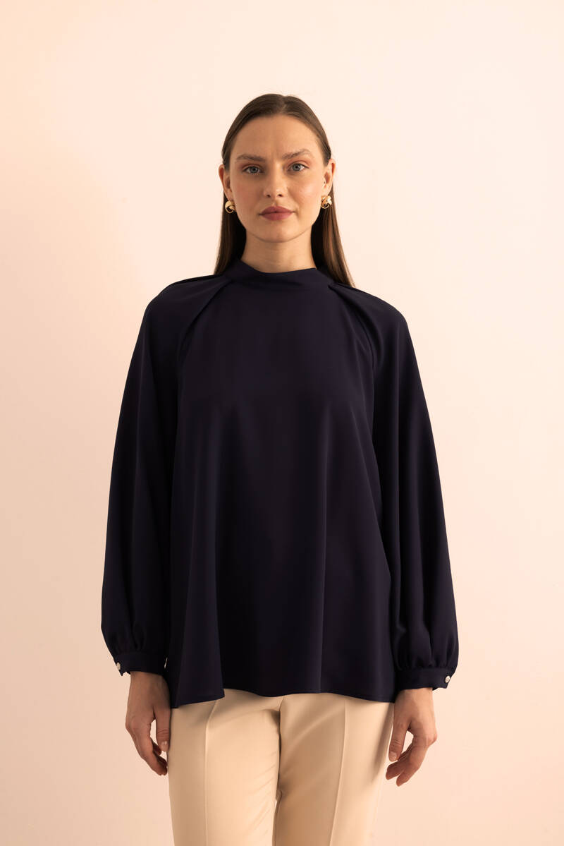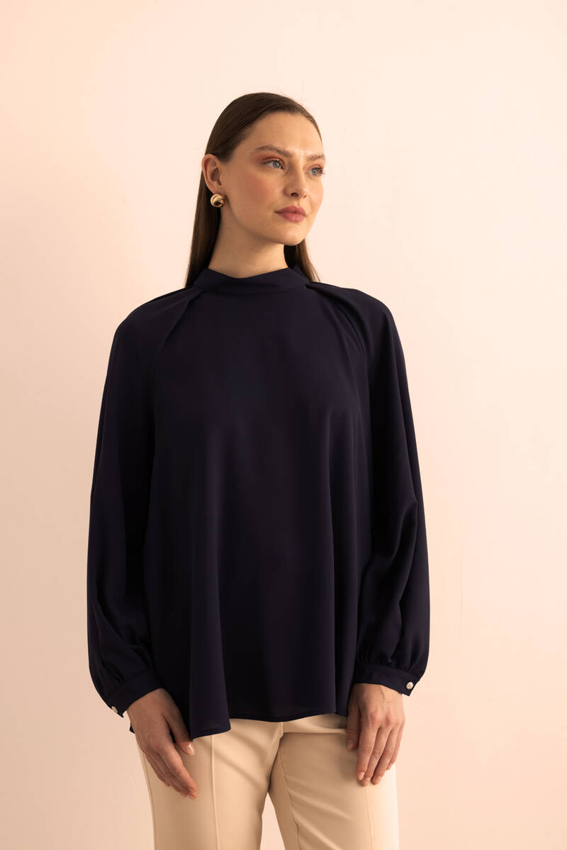 Lacivert Yandan Pili ve İşleme Detaylı Dokuma Bluz