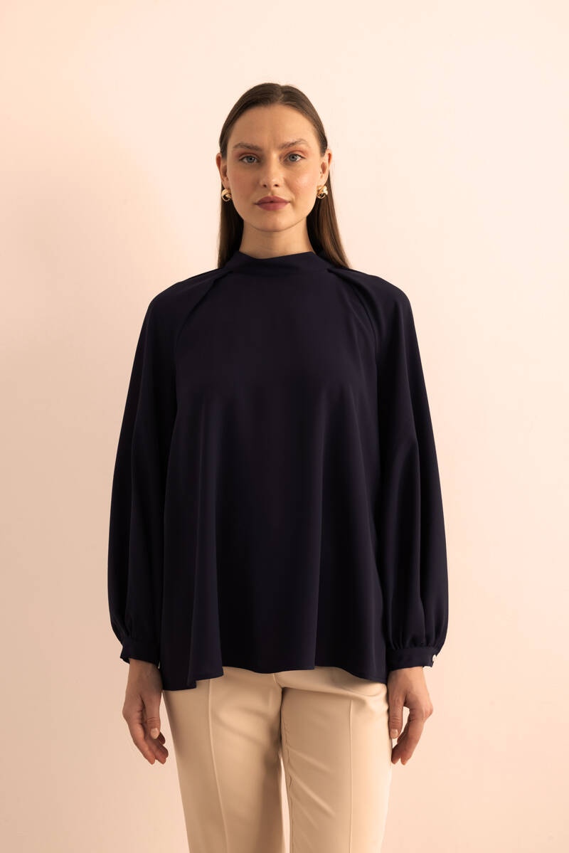 Saks Ön Göğüs Kısmı Pile ve Parça Detaylı Bluz