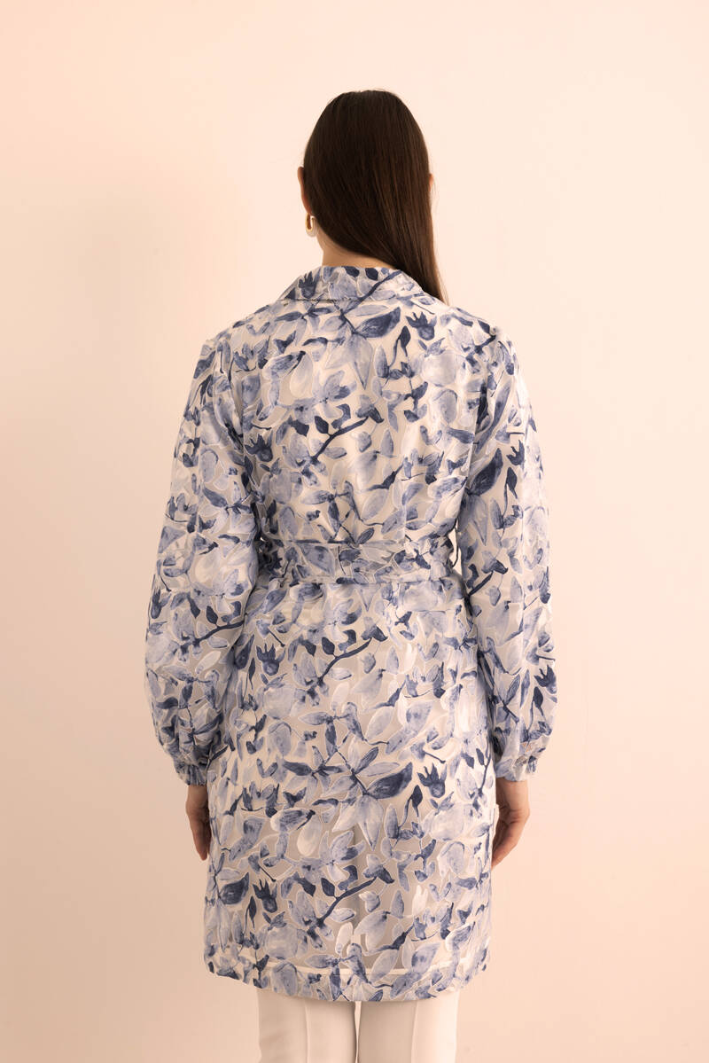 Ekru Yaprak Desenli Keten Yandan Bağlamalı Kimono