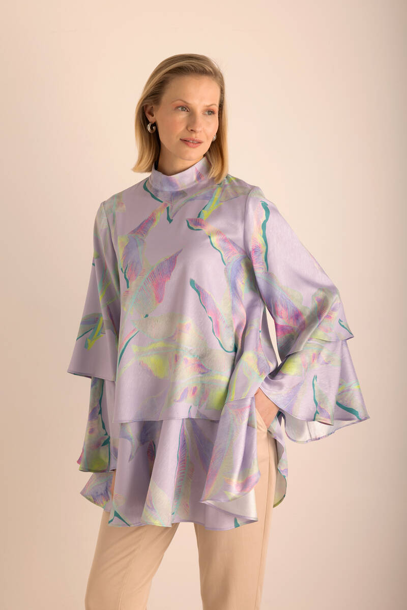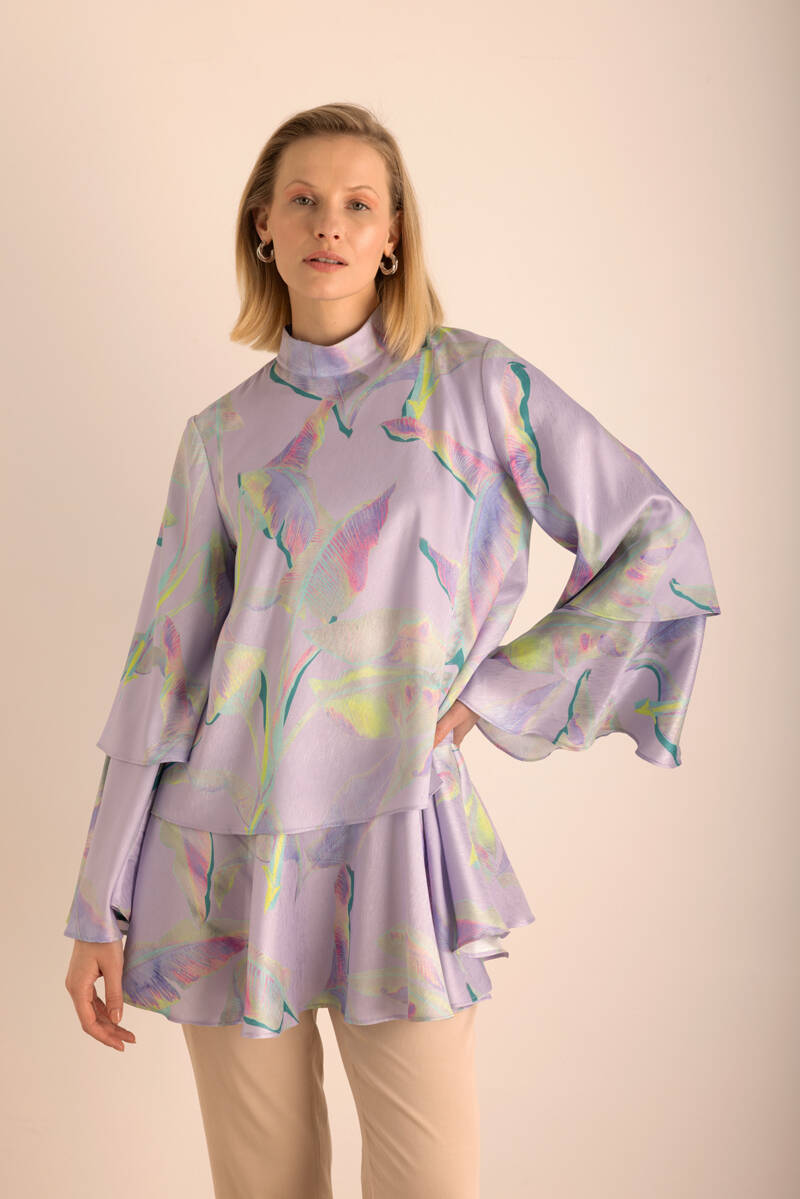 Pembe Batik Desenli Dik Yakalı Bluz
